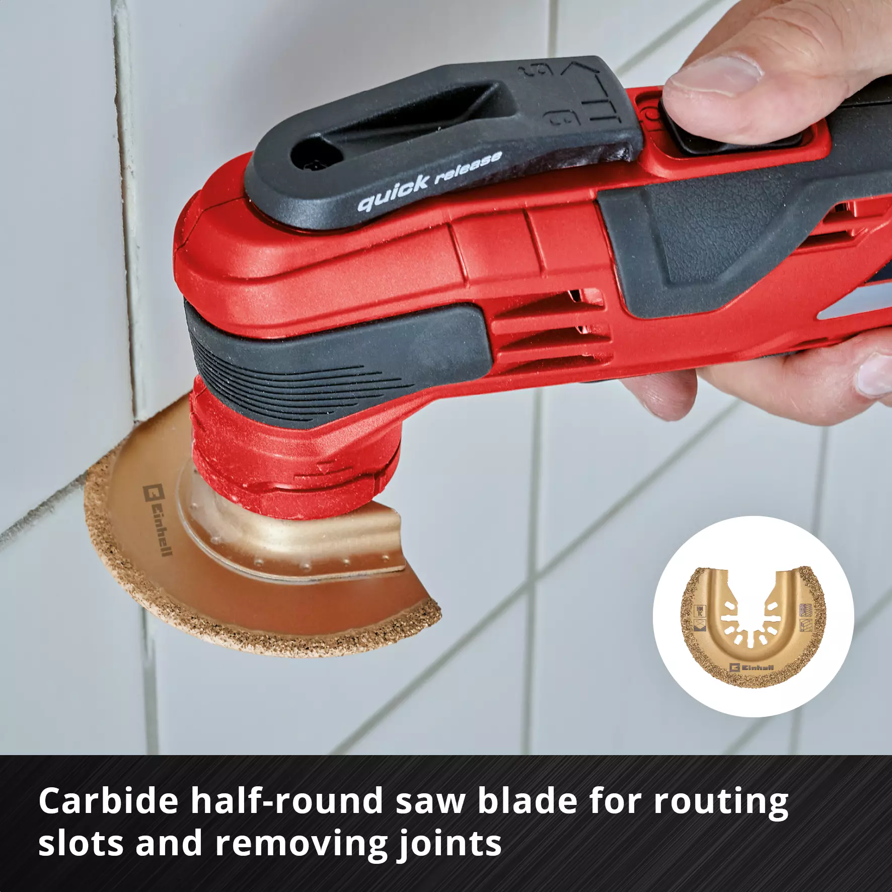 Flexible scraper – Thanks to the flexible body of the 50 mm scraper, adhesive residues and silicone residues can be removed effortlessly as the Einhell multitool adapts to surfaces.