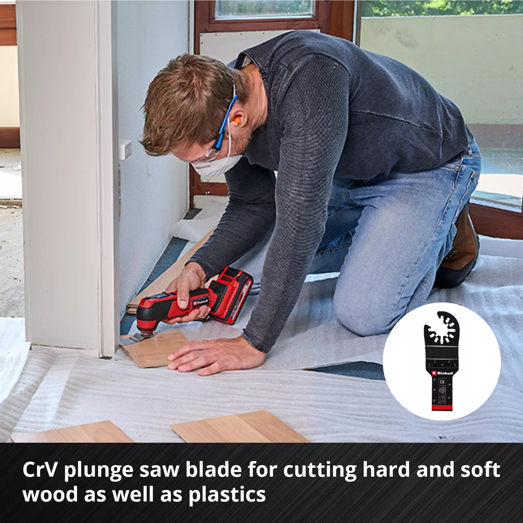 CrV plunge saw blade – Thanks to the robust, durable CrV steel of the 20 mm plunge saw blade, the multifunction tool is specially designed for cutting wood and plastic.
