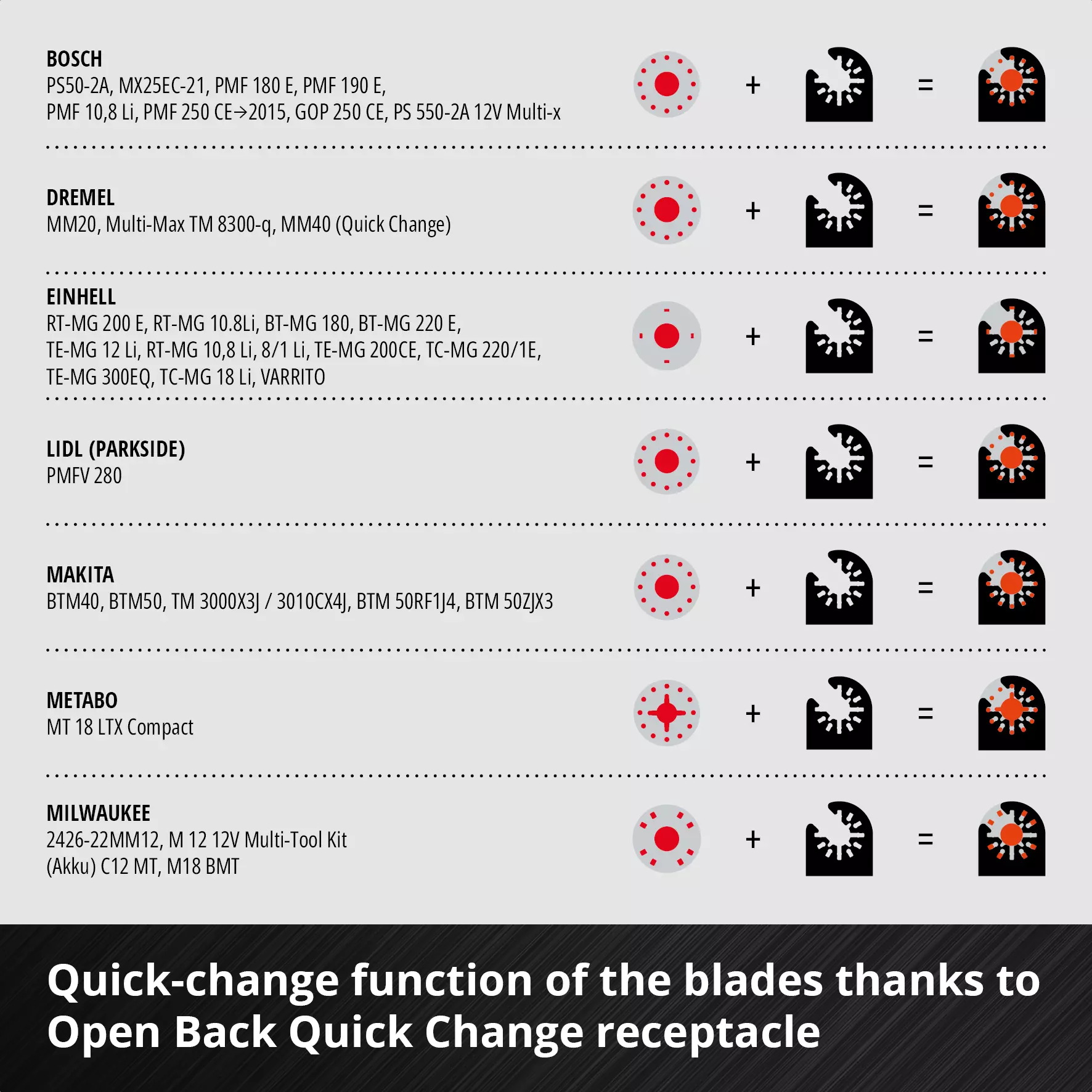 Quick change function – The Open Back Quick Change receptacle ensures that blades can be changed quickly and fits all standard multifunction tools.