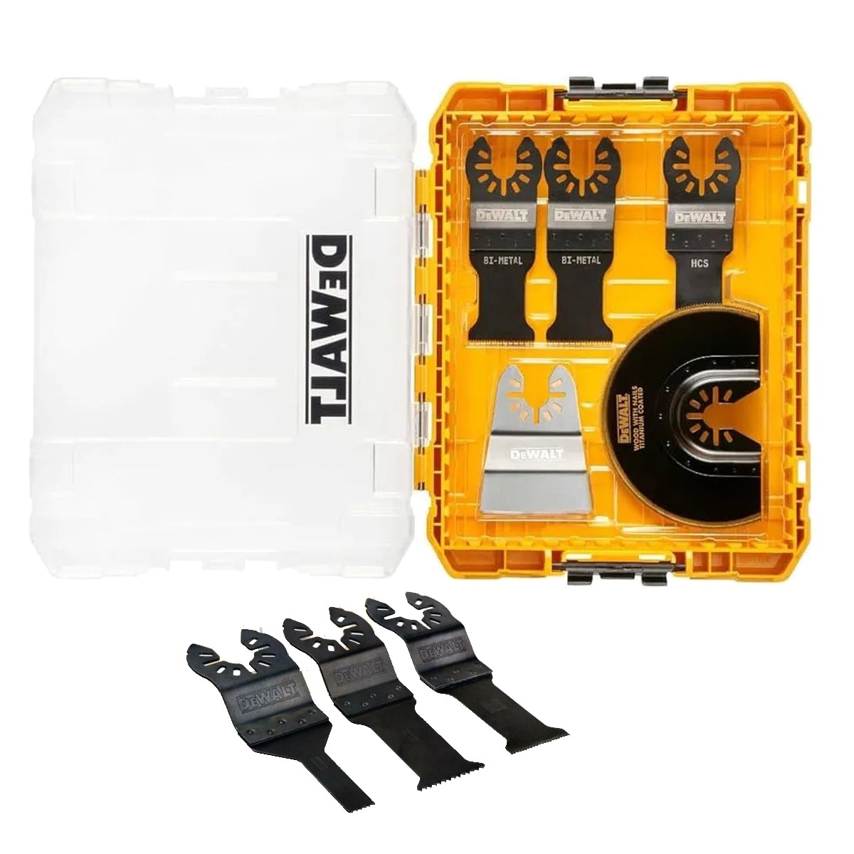 Includes two half round saw blades, two plunge cut blades, flexible scraper and a carbide rasp