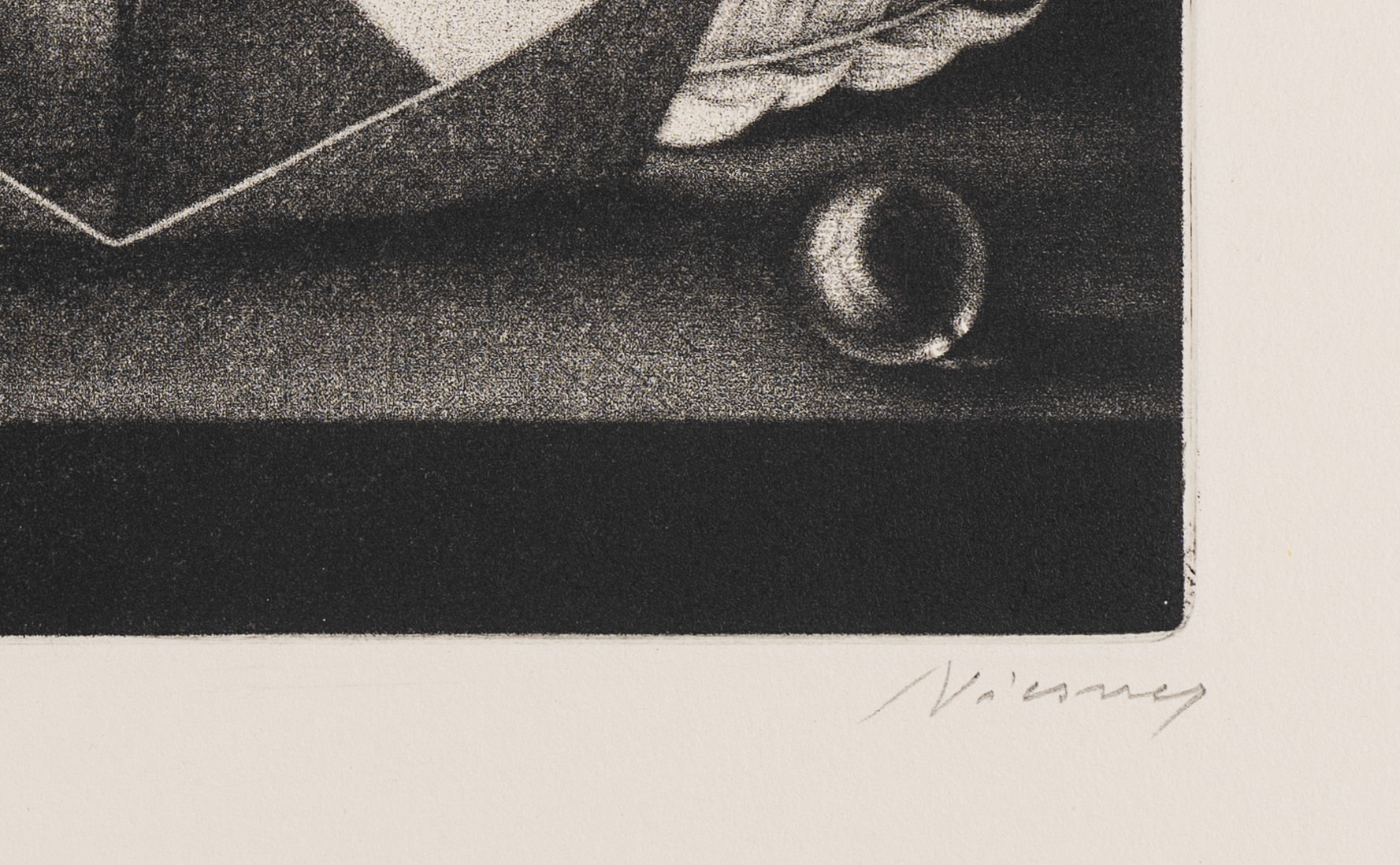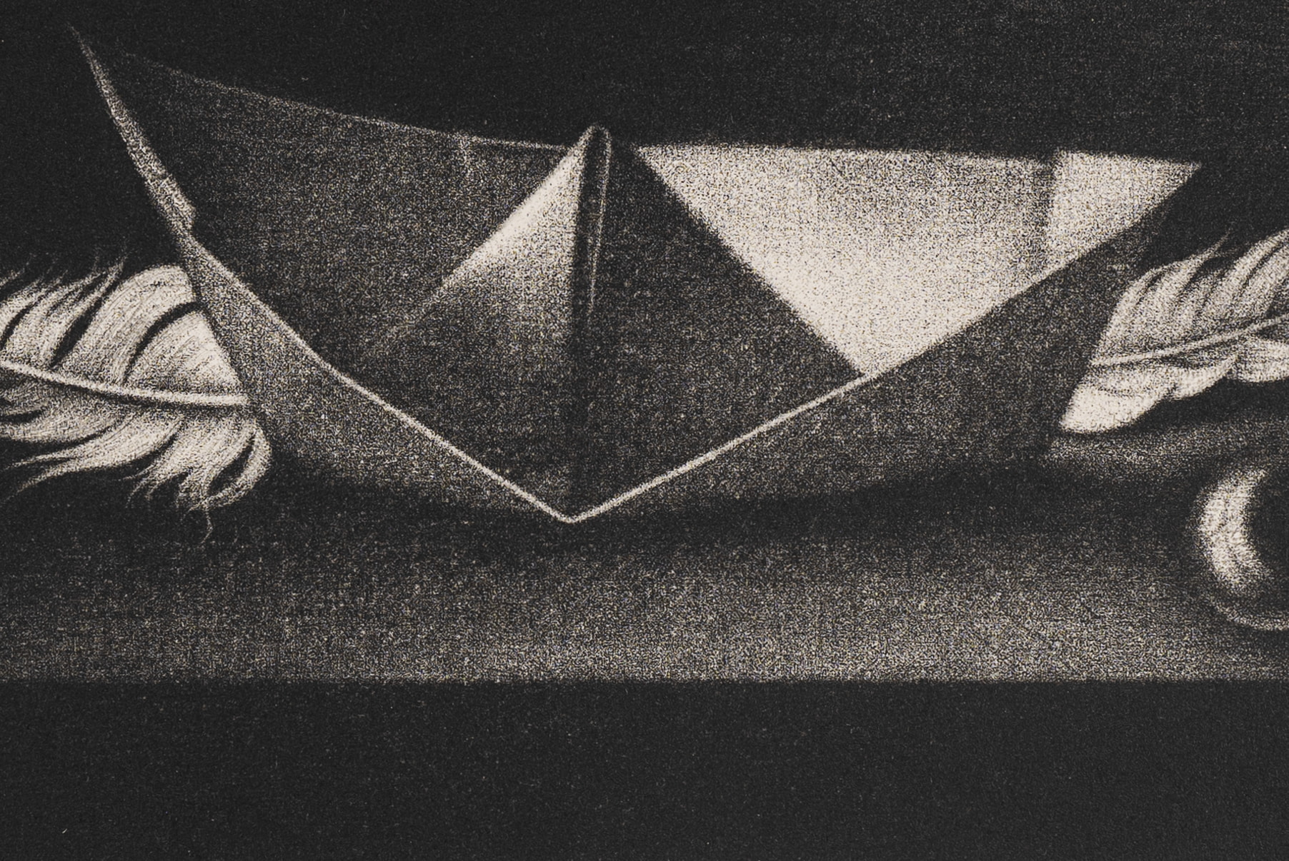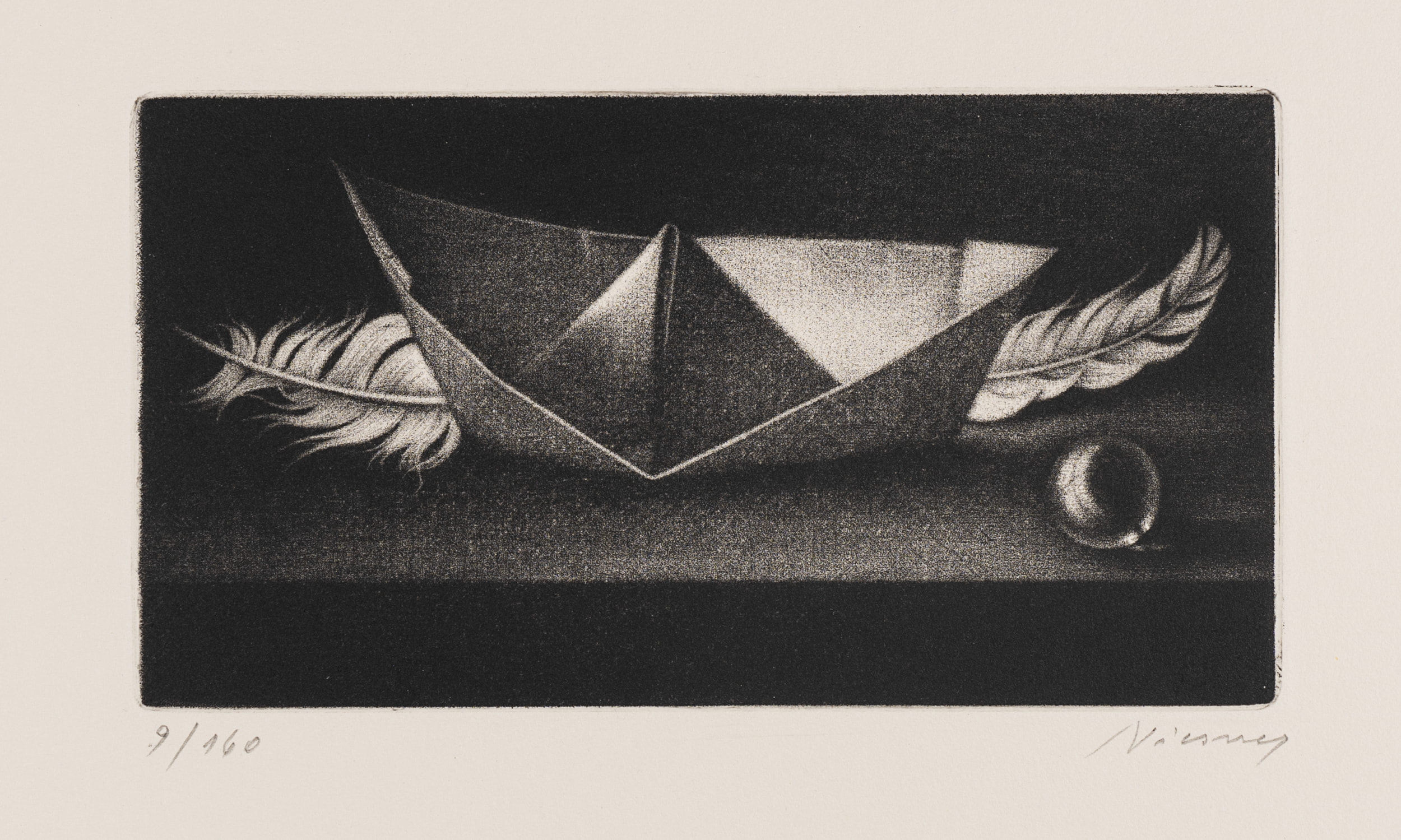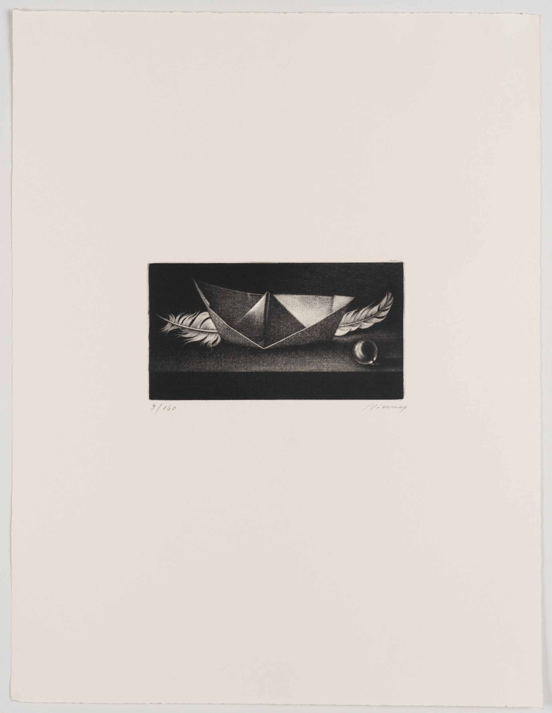 Wolfgang Niesner (1925 Freudenthal - 1994 Munich), Still life Composition of paper ship, feather and marble, 20th century, Mezzotint