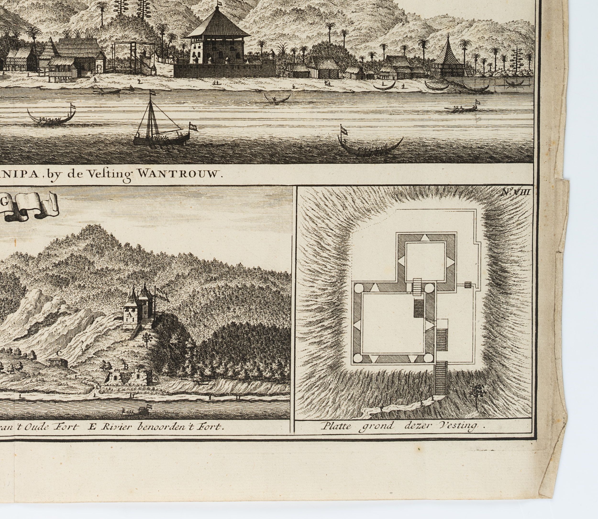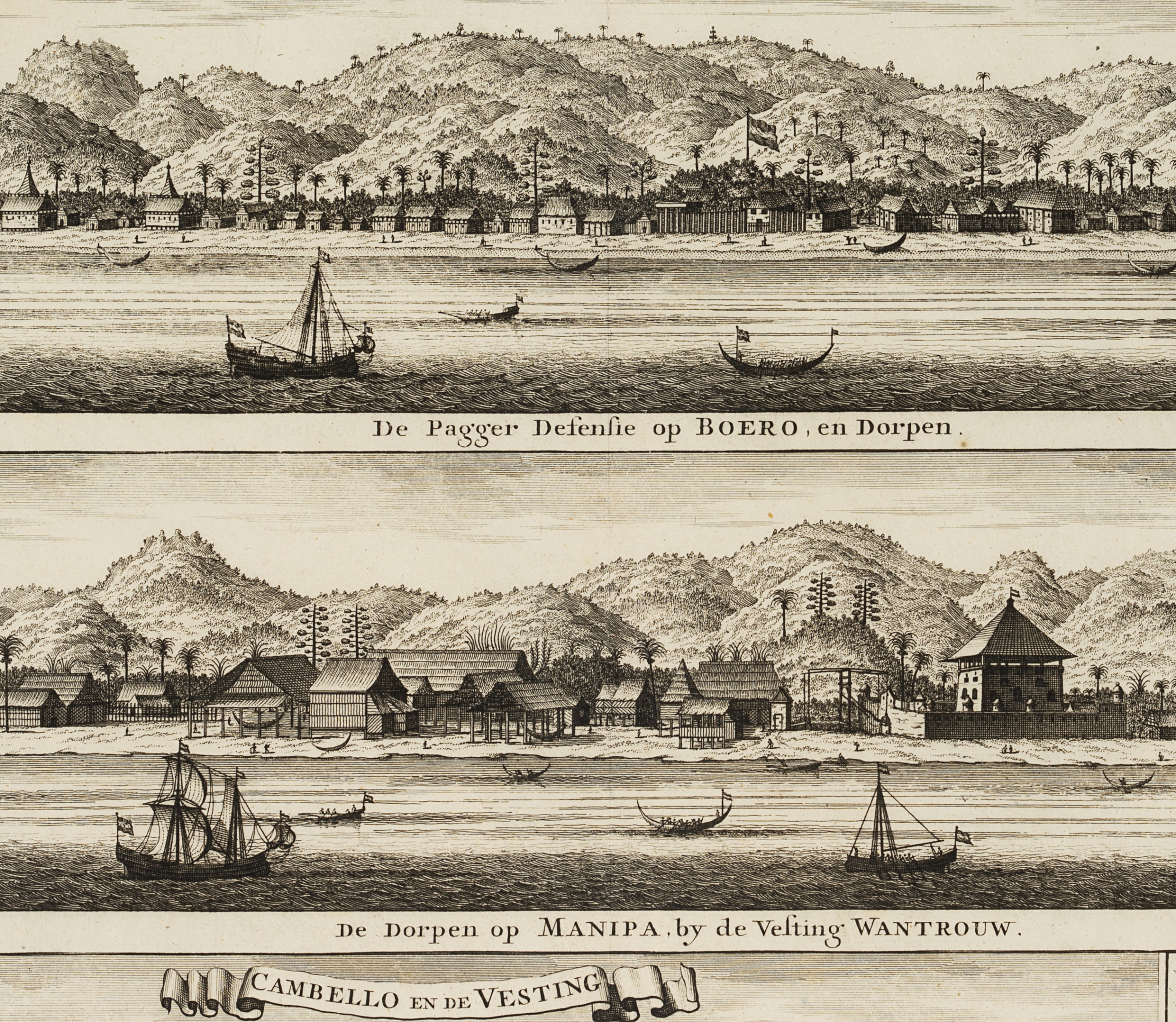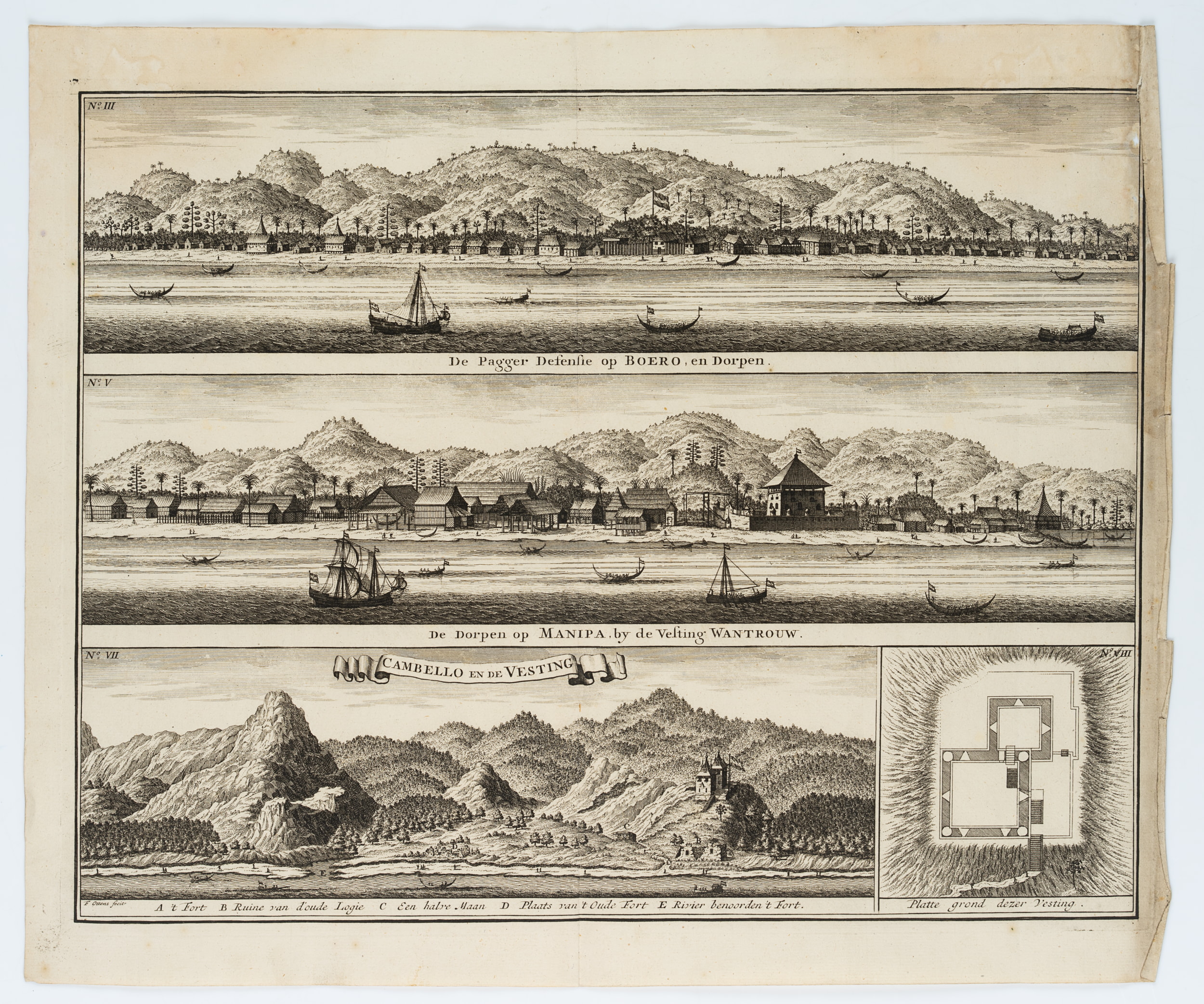Frederik Ottens (before 1700 Amsterdam - after 1770 ibid.), Views of the forts of Boero, Wantrouw in Manipa and Cambello, c. 1724, Copper engraving