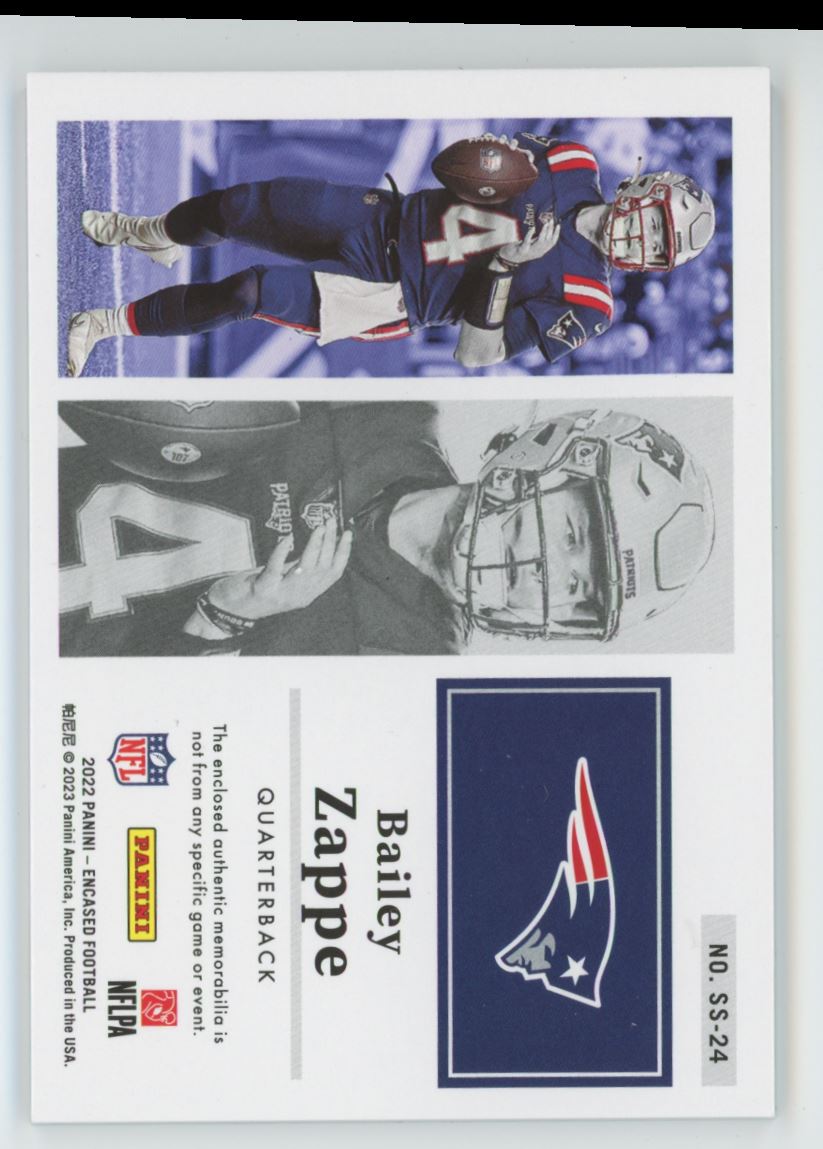 | Bailey Zappe 2022 Panini Encased Substantial Rookie Sapphire RC /50 Swatches |