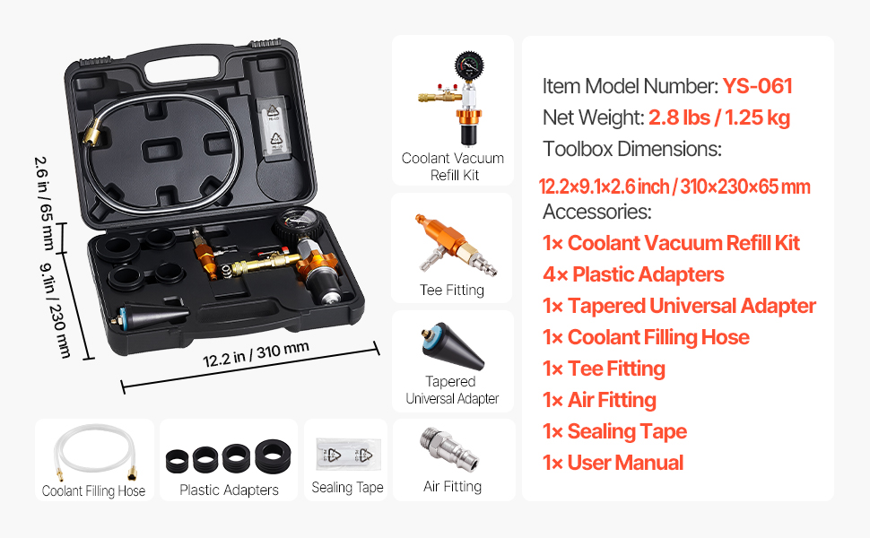 Aufbewahrungsbox: Dieses Kühlmittel-Vakuum-Nachfüllgerät wird mit einer staub- und wasserdichten Werkzeugbox geliefert, in der alle Komponenten übersichtlich aufbewahrt werden. Hinweis: Kühlmittel niemals bei heißem Motor wechseln. Tragen Sie stets Schutzbrille und Handschuhe und gehen Sie vorsichtig mit dem Kühlmittelsystem um, um heiße Flüssigkeitsspritzer zu vermeiden