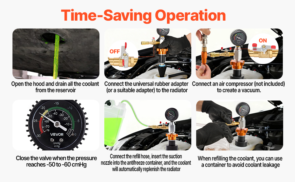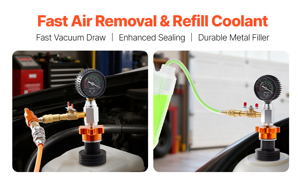Kühler-Vakuum- und Füllset: Das Kühler-Vakuum-Nachfüllset saugt und füllt Kühlmittel schnell ab und hilft, Lufteinschlüsse zu vermeiden und eine bessere Zirkulation zu gewährleisten. Funktioniert mit einem Luftkompressor (nicht im Lieferumfang enthalten), um Zeit zu sparen und mühsames Entlüften zu vermeiden