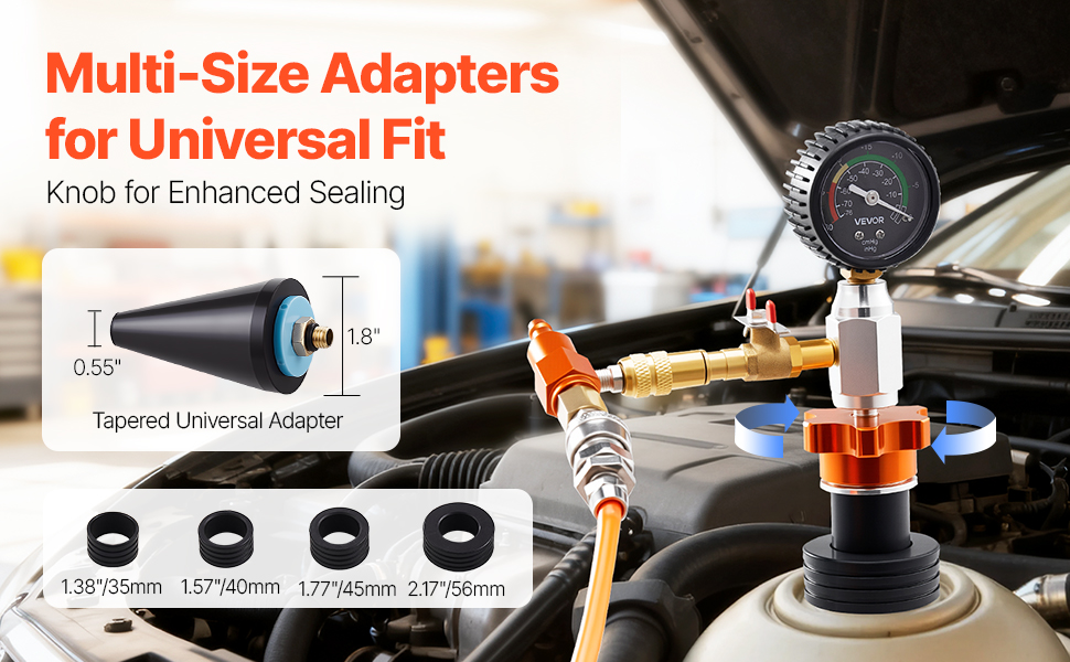 Passend für die meisten Fahrzeuge: Das Vakuum-Kühlmittel-Füllset enthält mehrere Adapter mit Außendurchmessern von 35/40/45/55 mm (1,38/1,57/1,77/2,17 Zoll) sowie einen konischen Universaladapter (passt für 0,55–1,8 Zoll) und passt für die meisten Autos, SUVs, Pickups und Kleinlaster, darunter BMW, Ford, Fiat, Volkswagen, Porsche, Mercedes-Benz, Nissan, Mercedes-Benz und Nissan