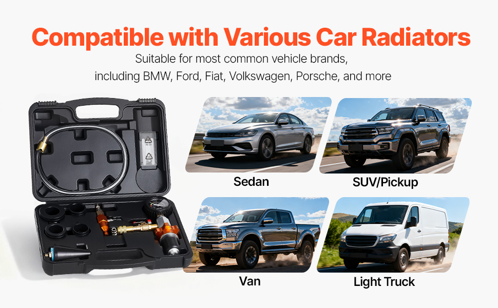 Kompatibel mit BMW, Ford, Fiat, Volkswagen, Porsche, Mercedes-Benz, Nissan und anderen gängigen Modellen. Das Vakuum-Kühlmittel-Füllset ist für Autos, SUVs, Pickups und leichte Lastwagen geeignet und bietet umfassende Vielseitigkeit.