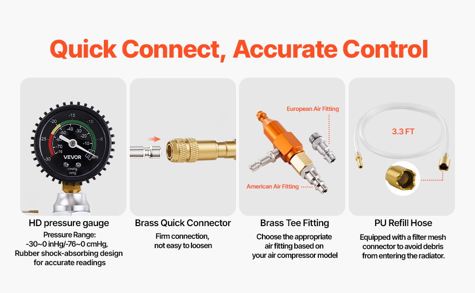 Vakuum-T-Stück & Füllschlauch: Unser Vakuum-Nachfüllsystem verfügt über eine US-Standard-Luftdüse mit einer zusätzlichen EU-Düse für einen flexiblen Kompressoranschluss. Enthält einen 3,3 Fuß (1,01 m) langen, transparenten, langlebigen Füllschlauch mit integriertem Filter, um das Eindringen von Schmutz in den Kühler zu verhindern