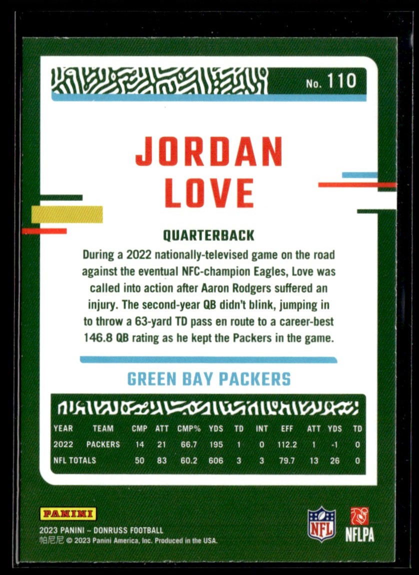 | Jordan Love 2023 Donruss No Name SP #110 Green Bay Packers |