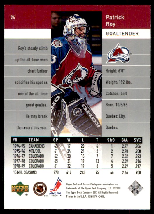 | 1999-00 Upper Deck Black Diamond Patrick Roy Colorado Avalanche #24 |
