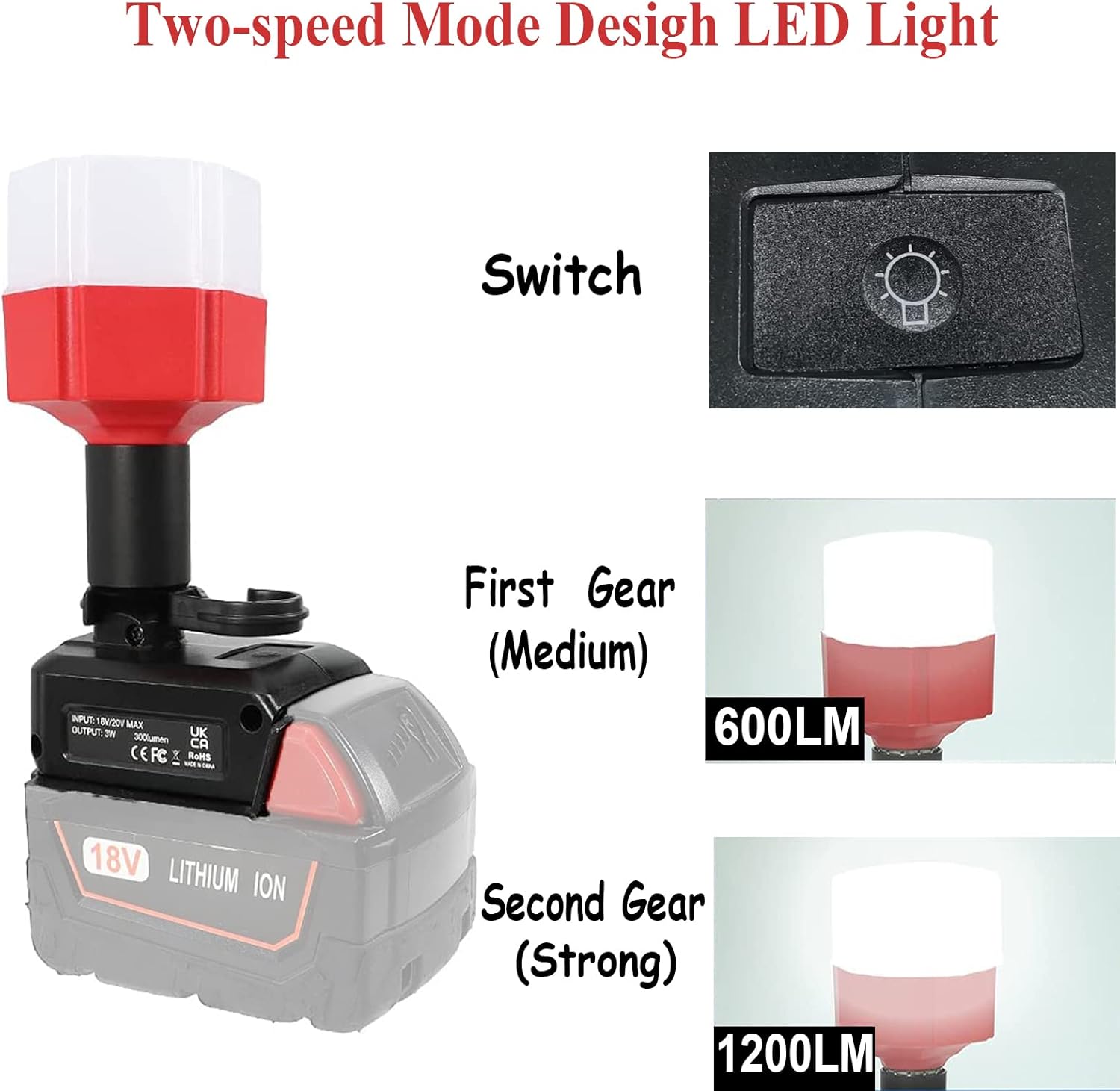 🌟【Bright LED light:】--- 12W 1200LM high-power lithium-ion LED spotlight illuminates dark workplaces and work areas. Make 2 bright white LEDs to illuminate the work area on site. Press the switch button once for 50% white light brightness, and twice for 100% white light brightness. In any mode, long press to turn off the light.