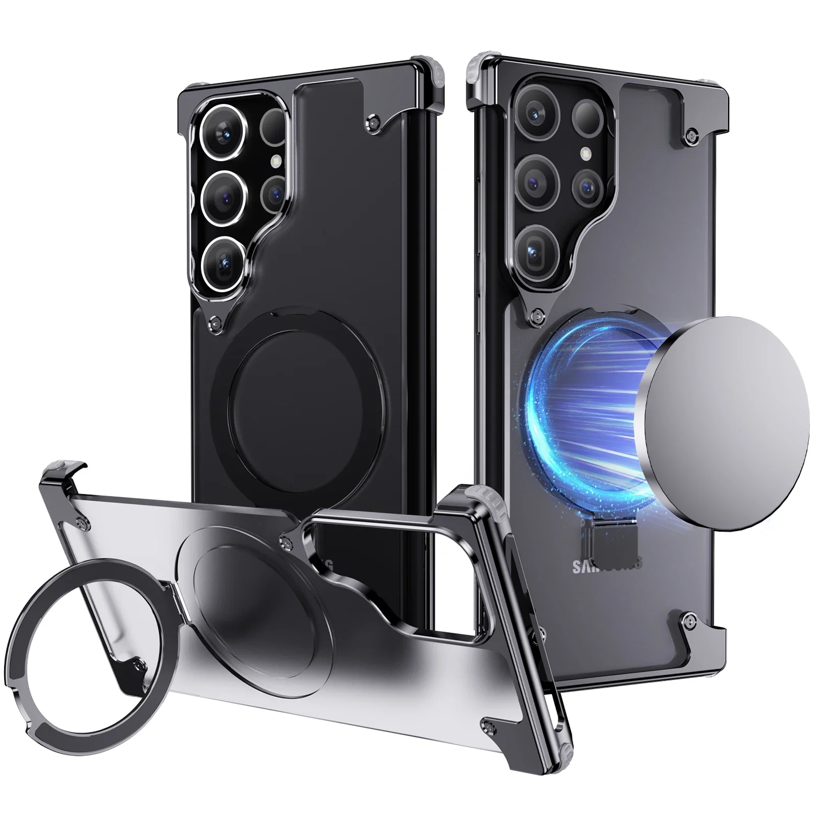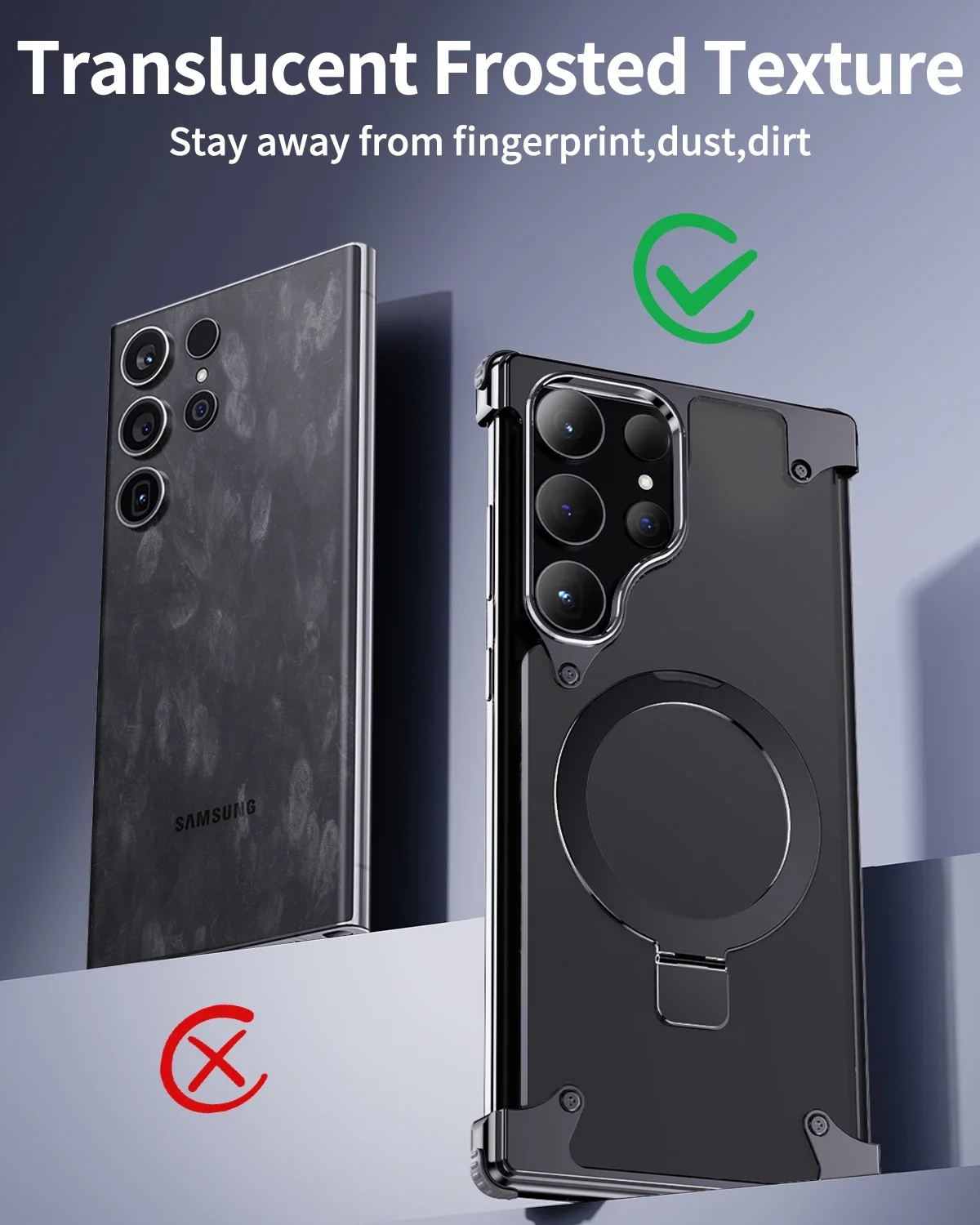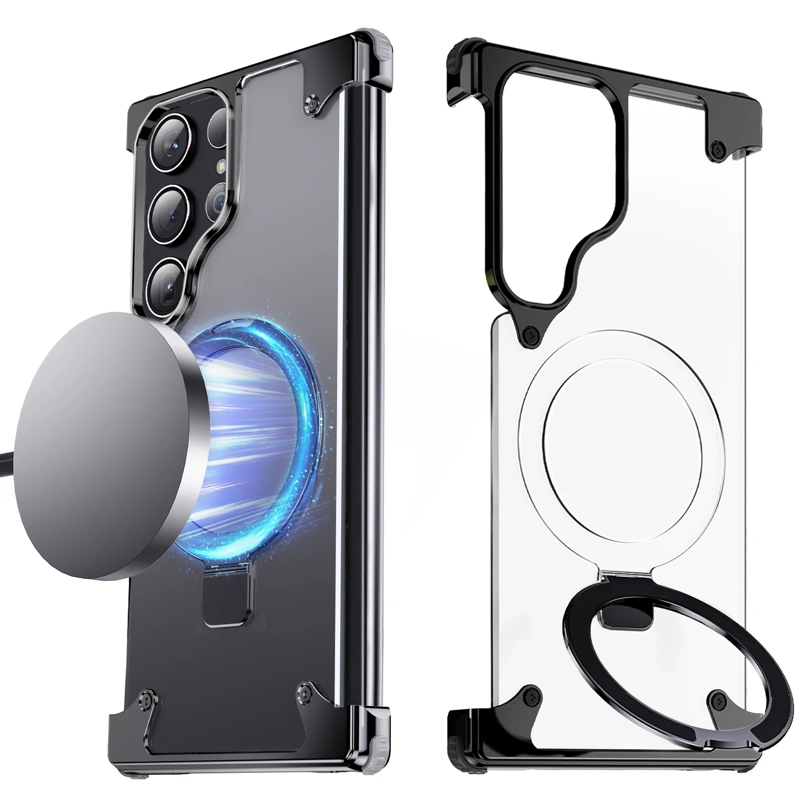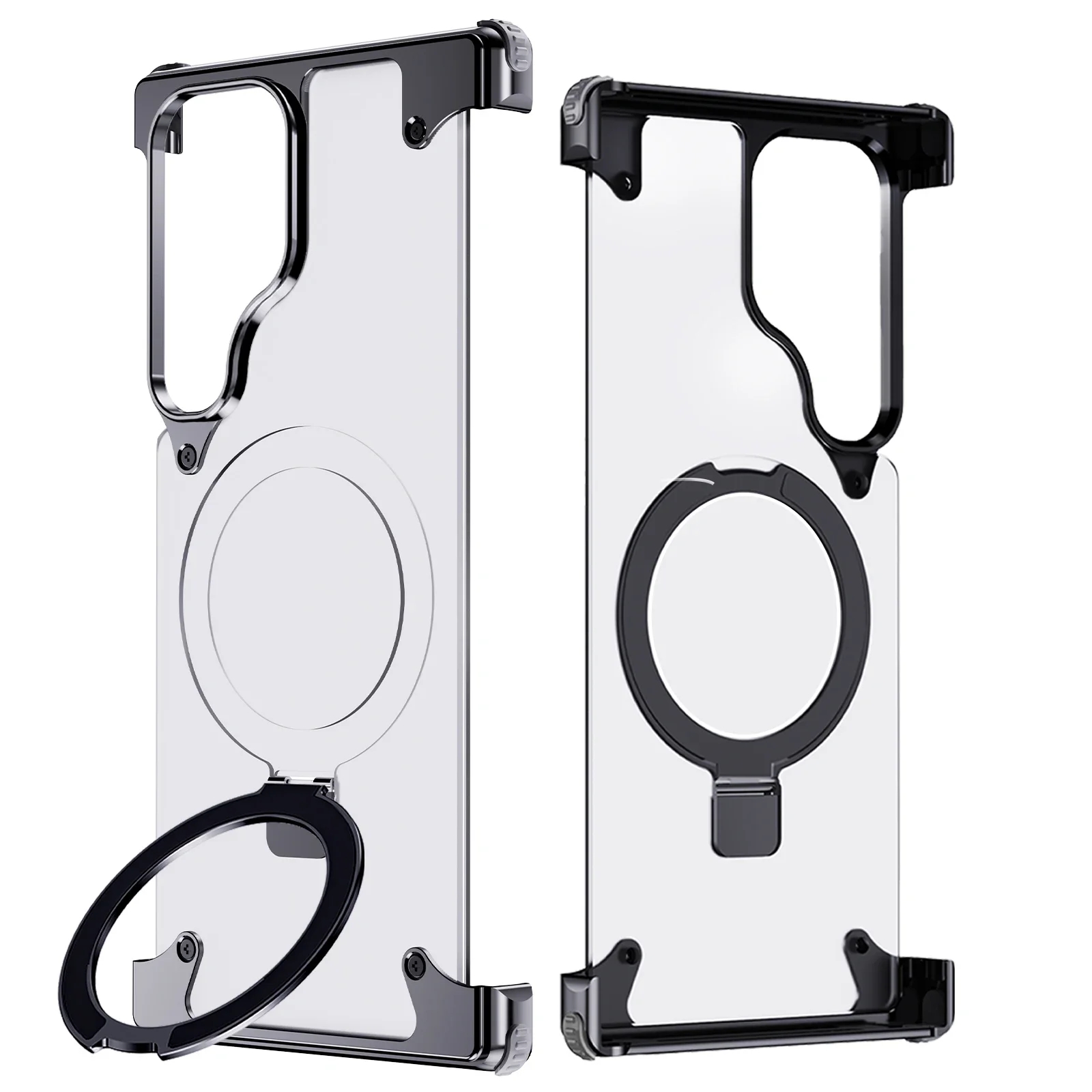 Metal Leather Phone Case For Samsung Galaxy S23 Ultra S24 Ultra Translucent PC Magnetic Ring Holder Wireless Charge Phone Covers