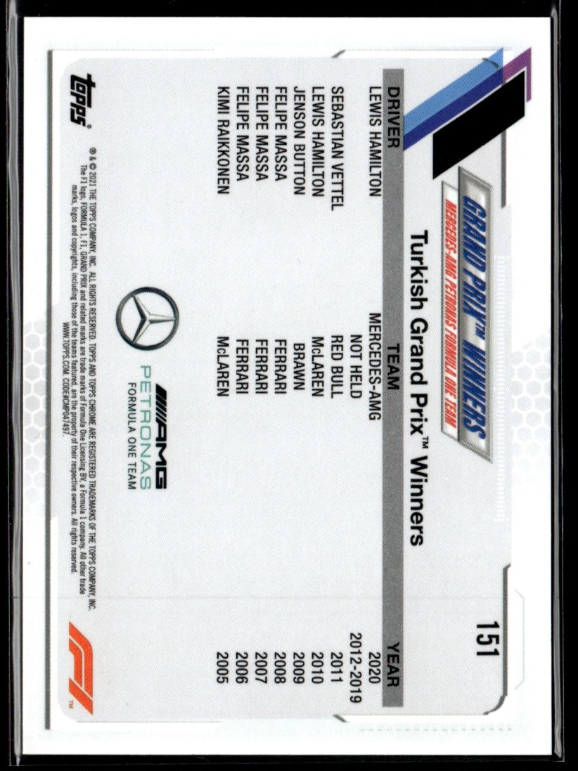 | Description: | Lewis Hamilton | | Category: | Racing | | Year: | 2021 | | Product: | Topps Chrome Formula 1 Orange Red Refractor | | Team: | Mercedes-AMG Petronas F1 | | Card Number: | 151 | | Dimensions: | 3½" x 2¾" | | SKU: | RA R0001 R54 B (6) |