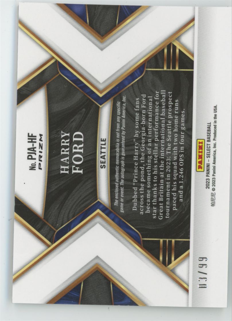| Description: | Harry Ford | | Category: | Baseball | | Year: | 2023 | | Product: | Panini Select Silver Prizm | | Team: | Seattle Mariners | | Card Number: | PJA-HF | | Hand Signed: | Yes | | Rookie: | Yes | | Memorabilia: | Jersey | | Serial Number: | /99 | | Dimensions: | 3½" x 2½" | | SKU: | BL R0001 R12 A (16) |