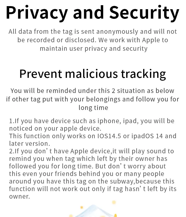 【Lost Mode Notifications】Activate Lost Mode through the Apple Find My app to leverage the vast network of Apple devices in locating your lost or stolen luggage or wallet. When another Apple device comes into contact with your tracking tag, you'll receive a notification with its updated location. This feature greatly increases the chances of recovering your belongings.