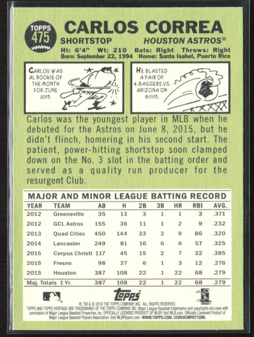 | Carlos Correa 2016 Topps Heritage Action Image Variation #475 Houston Astros |
