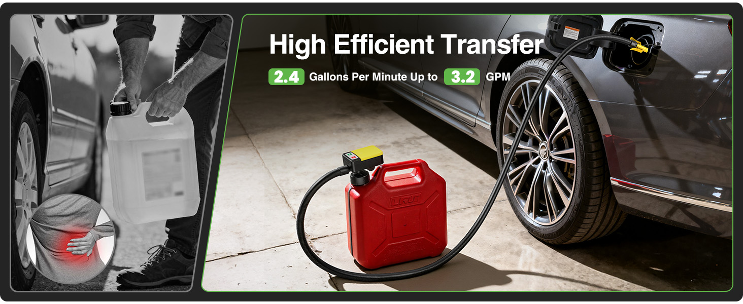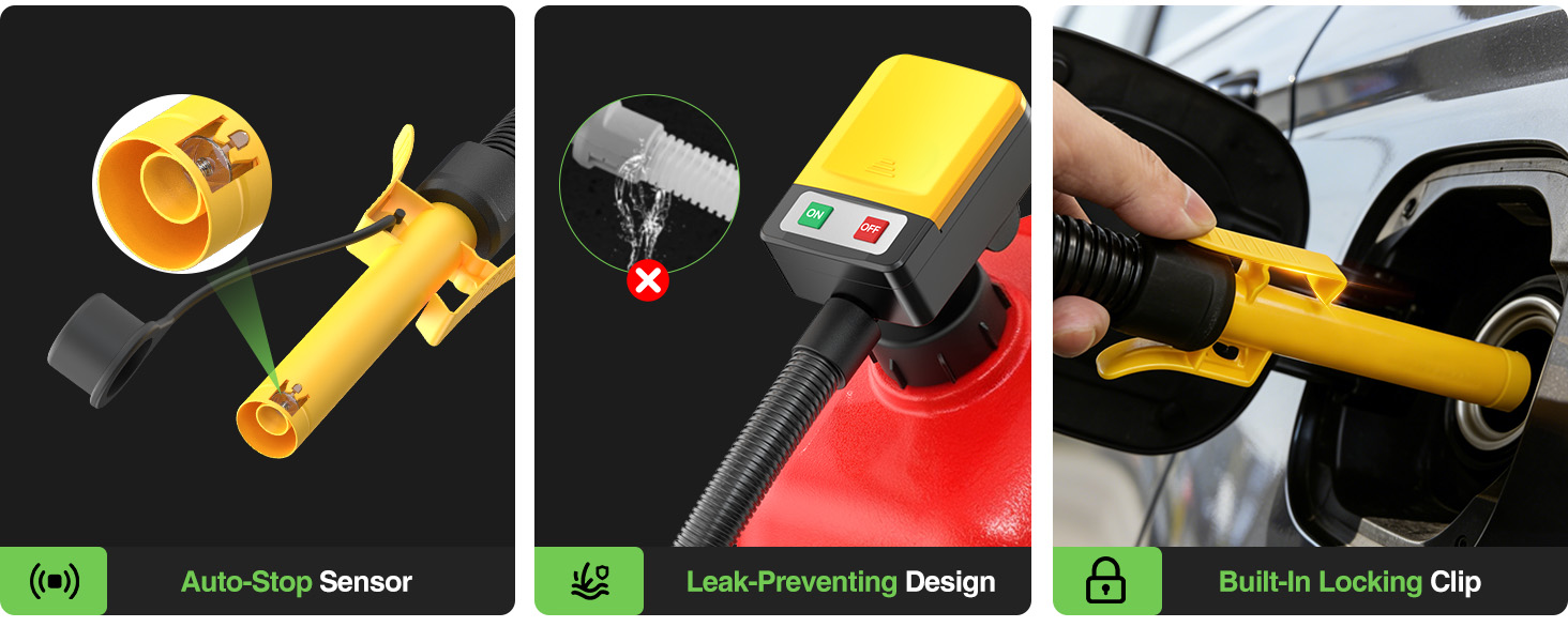 【Auto -stop Function 】: Leak Protection,the sensitive auto-stop sensor will stop the flowing timely when the fuel full, no worry about leak and overflow, clear and safe.