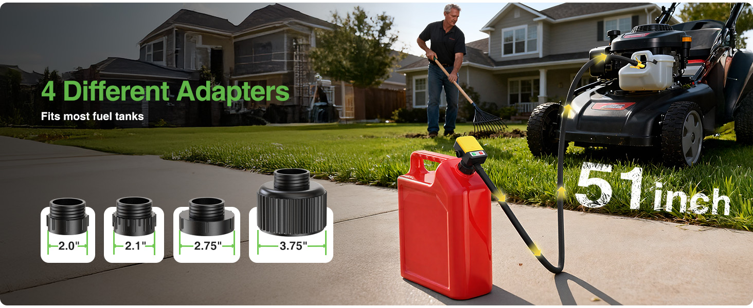 【Universal Fit with Extra-Long Hose】Comes with 4 adapters (2.0″, 2.1″, 2.75″, 3.75″) to fit most North American fuel cans. The 51″ extended hose provides reach and flexibility for transferring fuel into cars, motorcycles, tractors, or boats with ease and without messy spills.