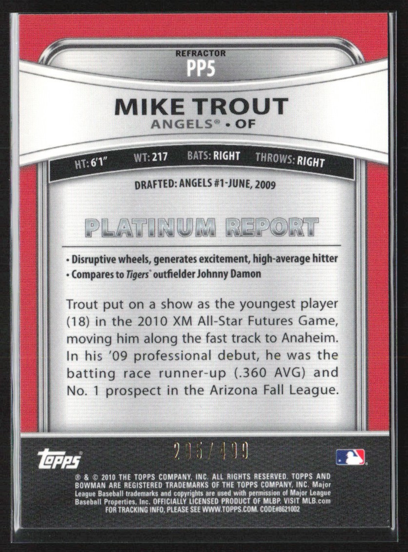 | Mike Trout 2010 Bowman Platinum Prospects Green Refractor /499 A #PP5 Los |