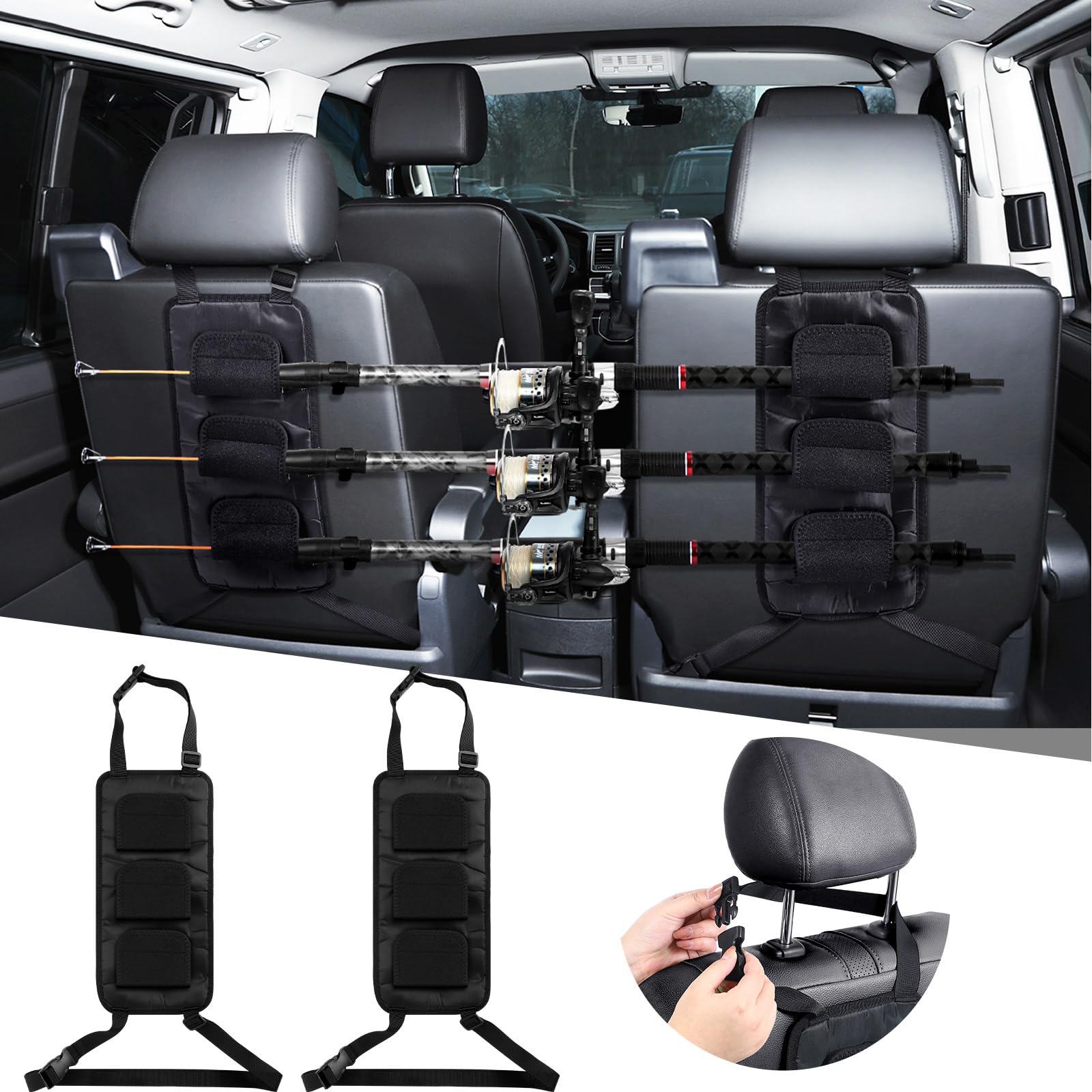 - Save Your Space: comes with 2 fishing pole organizers for vehicle seats, each capable of holding up to 3 fishing poles; This doubles your capacity and helps transform your space into a well organized, making for a more seamless and efficient fishing experience, back seat passengers do not have to give up any legroom, and space in the back seat can be freed up for sitting