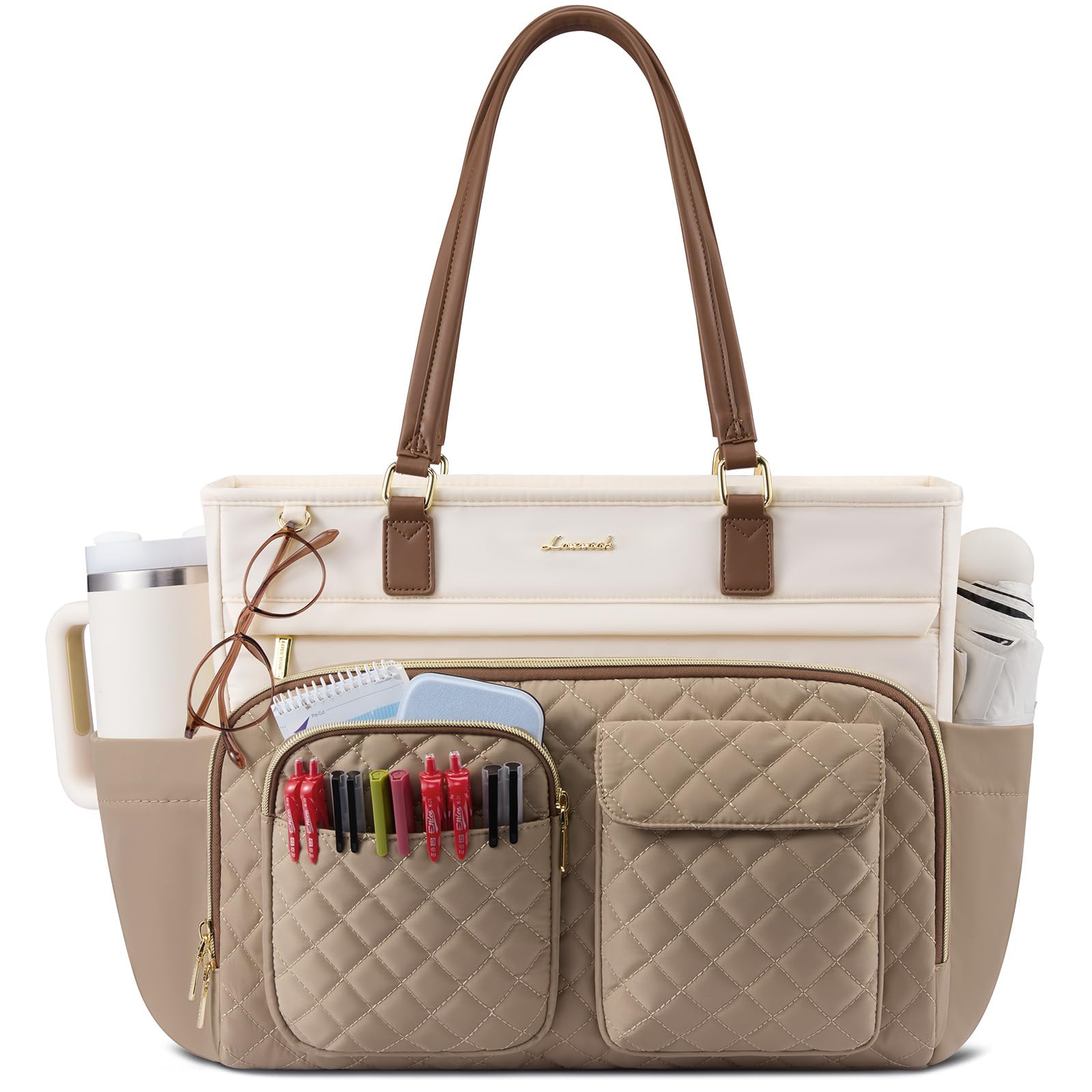 LOVEVOOK Tote Bag, Work Bags for Women with Large Cup Holder, Large Capacity Teacher Tote with Multi Pockets, Nurse Diaper Tote with Padded Laptop Compartment, 15.6 Inch Khaki Beige