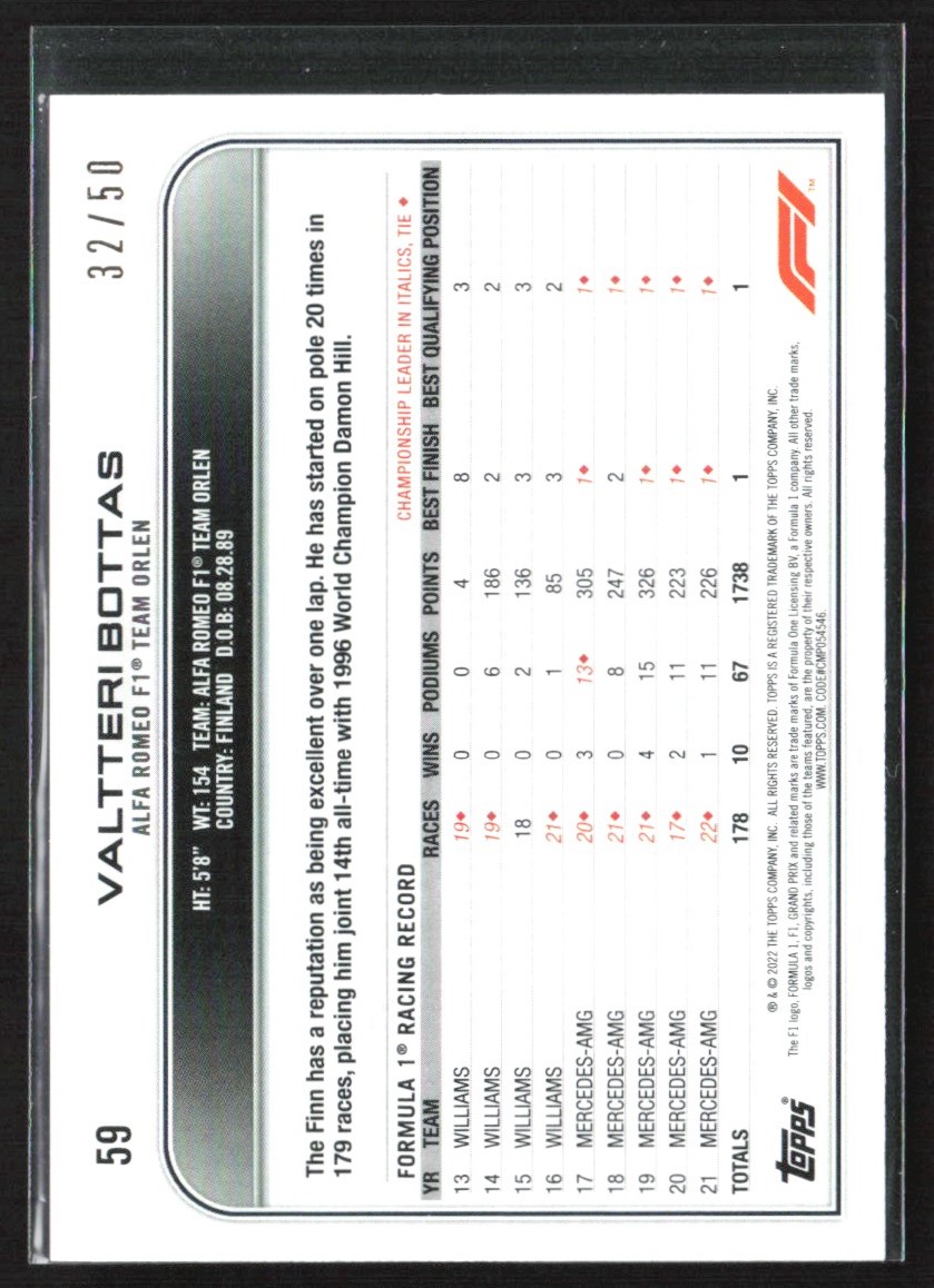 | Valtteri Bottas 2022 Topps Chrome Formula 1 F1 Gold /50 #59 Alfa Romeo Racing |