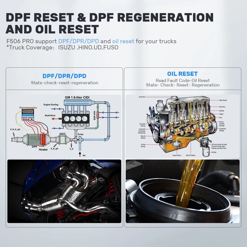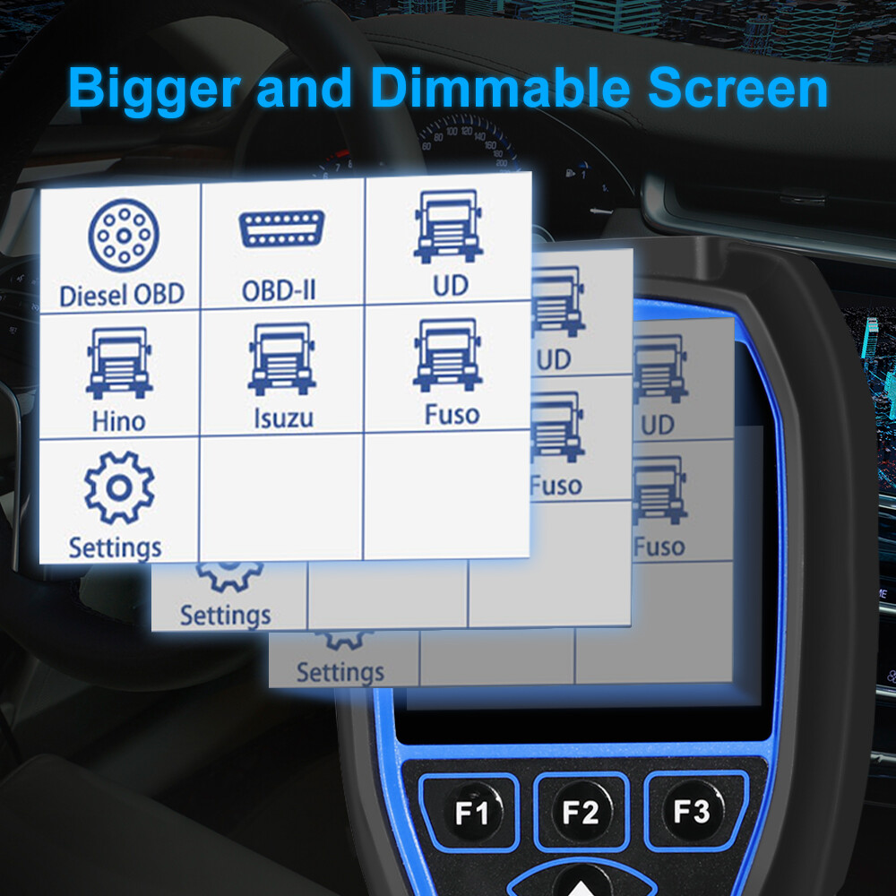 Powerful CompatibilityF506 PRO has extensive compatibility:Passenger cars, SUV’s Pickup Trucks, Truck;Tow trucks, recreational vehicles, cement trucks, dump trucks, garbage trucks, buses, step truck, municipal vehicles, refrigerated trucks, and conventional trucks;Heavy-Duty Standard compliant construction, marine, agriculture, and other industrial machinery and equipment;Diesel engines,Transmission, ABS, PDF, Service Reset, Cabin Chassis,SAE J1850PWM, SAE J1850 VPW, IS0 14230-4, IS0 9141-2,IS0 15765-4, SAE J1708, SAE J1939, OBDII. | SEARCH CODE WITH THE NUMBERThere is a built-in up-to-date OBD-II “Search codes with the number” Option in this device. Fault codes and their definitions can be found in the Option. A 3.5" TFT true color (262K) LCD display is fitted to provide a clear reading of the information contained in it. After a fault code is detected, the definition of the code will be shown by directly clicking the fault code selected. | FIX CAR BY YOUSELF--SAVE TIME AND MONEYPerform a complete diagnosis of your truck anytime, anywhere with FCAR 506 PRO check engine light diagnostic tool by youself. It is designed for fast use so you can get the results you want in the shortest time with Diagnostic Mode for reading/clearing error readers. It enables you repair the problem yourself, or let you know exactly what needs replacement in case you need to take your truck to a repair shop. This helps you avoid blind maintenance and repair costs that could amount to hundreds or thousands of dollars. |