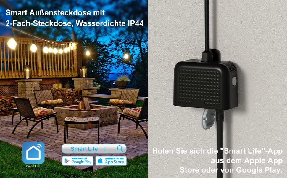 【Outdoor Socket】: IP44 weatherproof housing and socket cover prevent rainwater from entering, tested in harsh conditions such as rain, sleet and snow. Smart outdoor plugs are suitable for outdoor or indoor appliances such as gardens, patios, Christmas trees, kitchens, landscape lighting, bathrooms, porches, balconies, garages, basements, patios or electric grills, sprinklers, washing machines, lamps, etc. Do not use it with a pump.