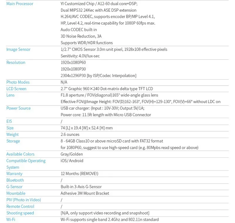 Main Processor (Maximum HD Support): Ambarella A7 (1080P/60FPS)