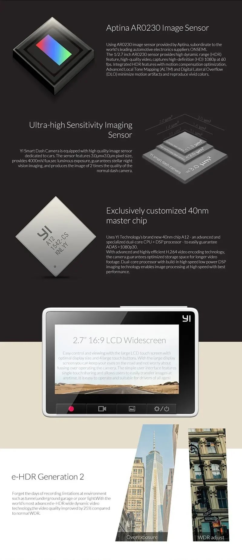 YI Ultra Dash Camera has low light sensitivity and Wide Dynamic Range (WDR) mode, giving it exceptional performance even in dim environments. The high quality full resolution 4 million WDR video keeps the crisp, high contrast and accurate details.