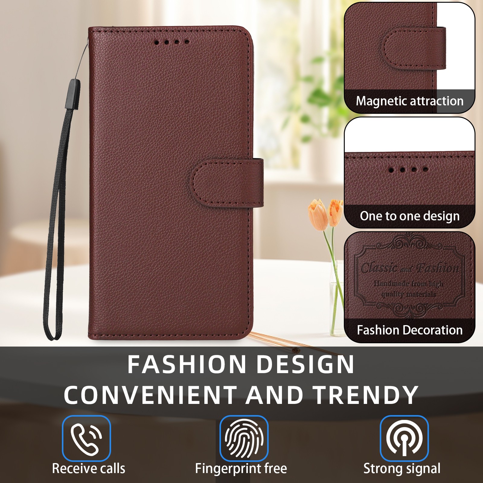 Premium PU leather + TPU material phone case with a secure card slot, flip-folding stand, detachable wrist strap and litchi-texture design — drop-proof and shockproof protection for everyday use.