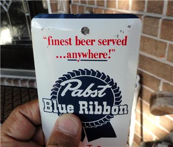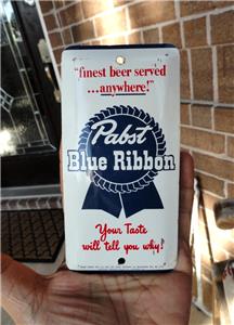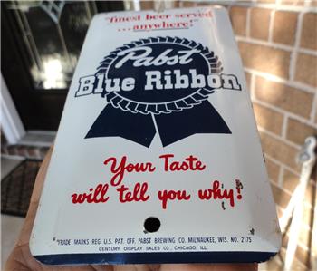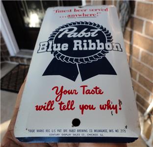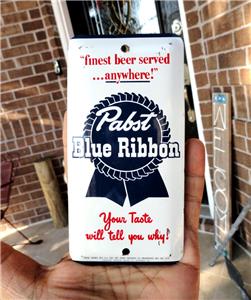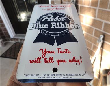 ~1950’s~FEATURED: vintage PABST BLUE RIBBON PBR Beer advertising Door Push Sign 1950’s! Measures about 3” across 6” tall. Front has: “finest beer served . . . anywhere!” / Pabst / Blue Ribbon (on top of the image of a “BLUE RIBBON”) / Your Taste / will tell you why!. . . at the bottom has: TRADE MARKS REG. U.S. PAT. OFF. PABST BREWING CO. MILWAUKEE, WIS. NO. 2175 / CENTURY DISPLAY SALES CO., CHICAGO, ILL.
