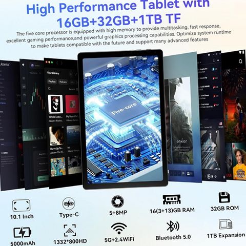 This Android 15 tablet combines advanced technology with user-friendly features to deliver a superior mobile computing experience. Powered by an efficient octa-core processor running at up to 2.4 GHz and supported by 16GB of RAM, it handles multitasking and demanding applications smoothly. The tablet offers 32GB of internal storage with the option to expand up to 1TB via microSD card, providing ample space for apps, media, and documents. Its 10.1-inch IPS LCD touchscreen boasts a sharp resolution of 1332 x 800 pixels, ensuring vivid colors and wide viewing angles that reduce eye strain during prolonged use. Dual cameras (5MP front and 8MP rear) enable clear video calls and quality photography. Connectivity options Wi-Fi and Bluetooth 5.3 for fast data transfer and peripheral support. The robust 5000mAh battery supports extended use for browsing, streaming, gaming, or productivity tasks without frequent recharging. Additional features integrated Alexa and Google Assistant support for hands-free control, pre-installed productivity apps like Word, Excel, and PowerPoint, and a silicone material build that offers durability and comfort. This tablet is suitable for users of all ages seeking a reliable device for entertainment, education, or work.