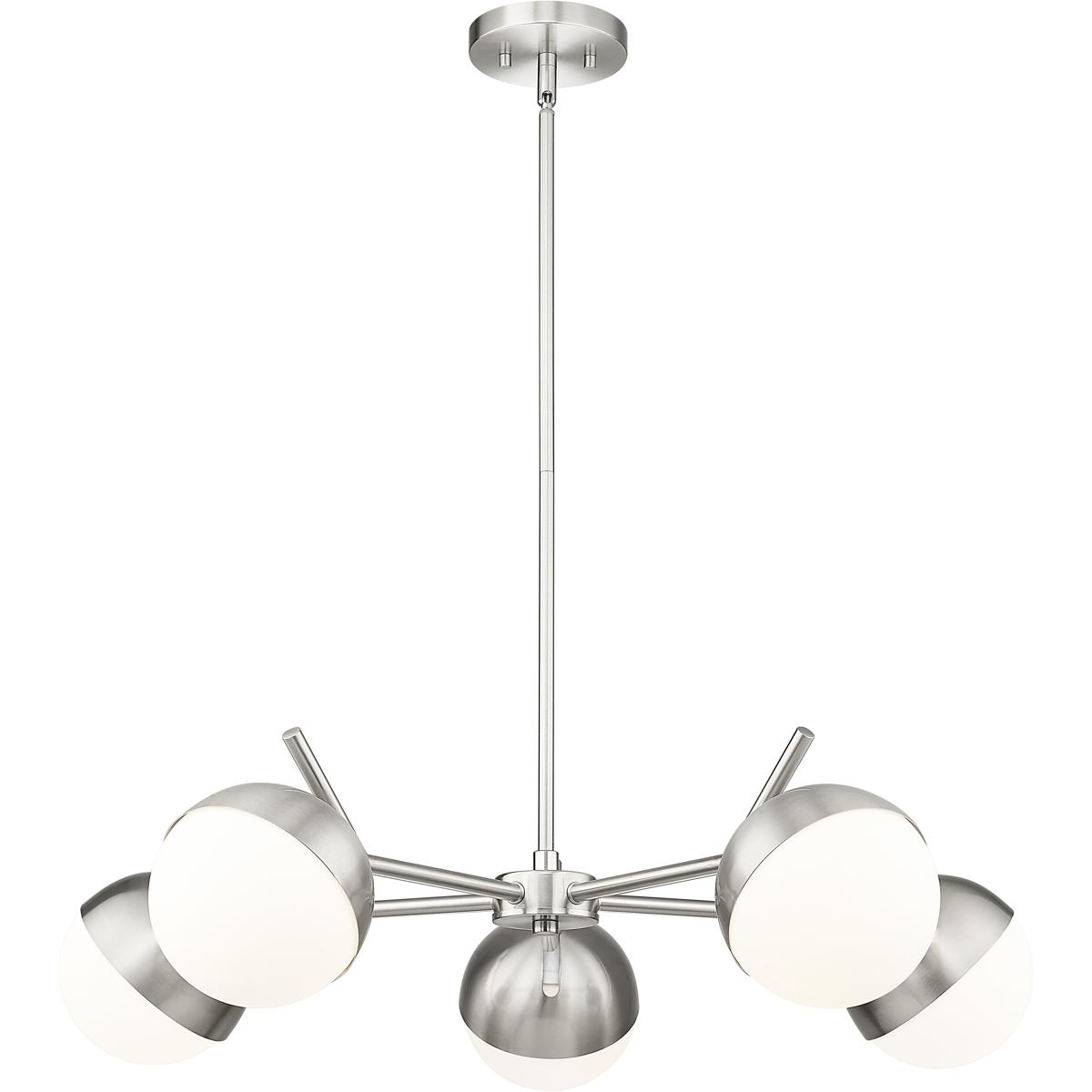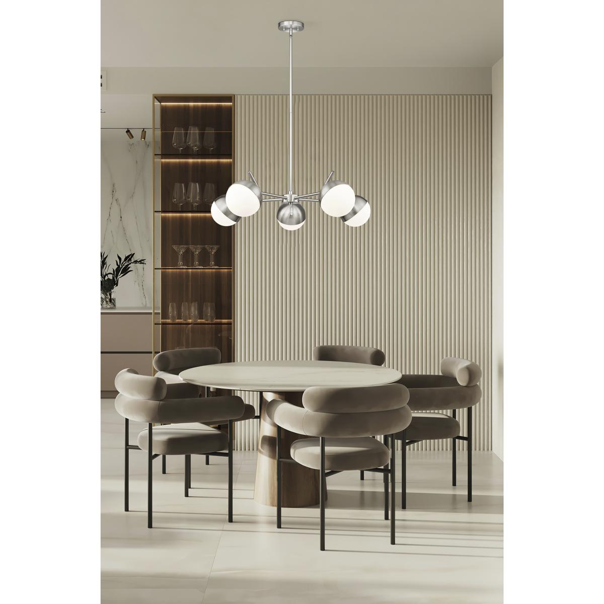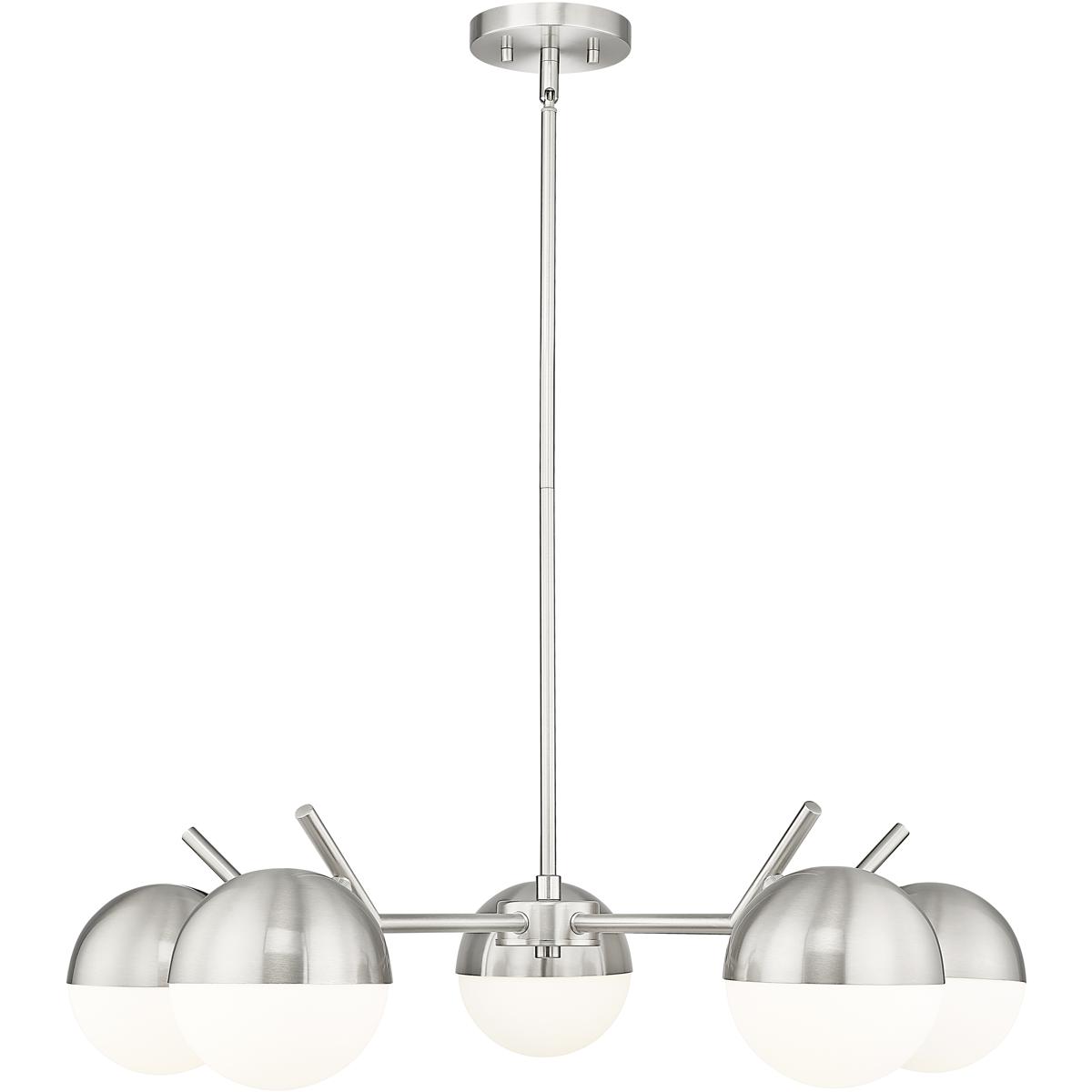 A radiant configuration of angular arms in a sleek brushed nickel finish create a compelling style for this modern five-light chandelier. Striking over a dining table or other gathering space, it features a clean, straight-lined silhouette and is complete with opal glass orb shades for inviting illumination.