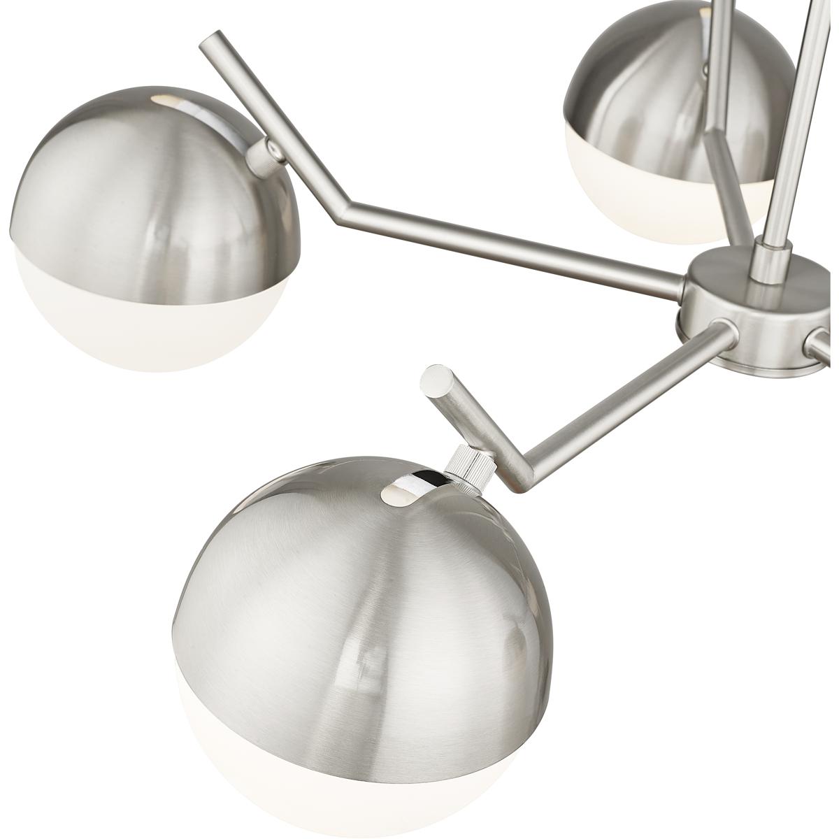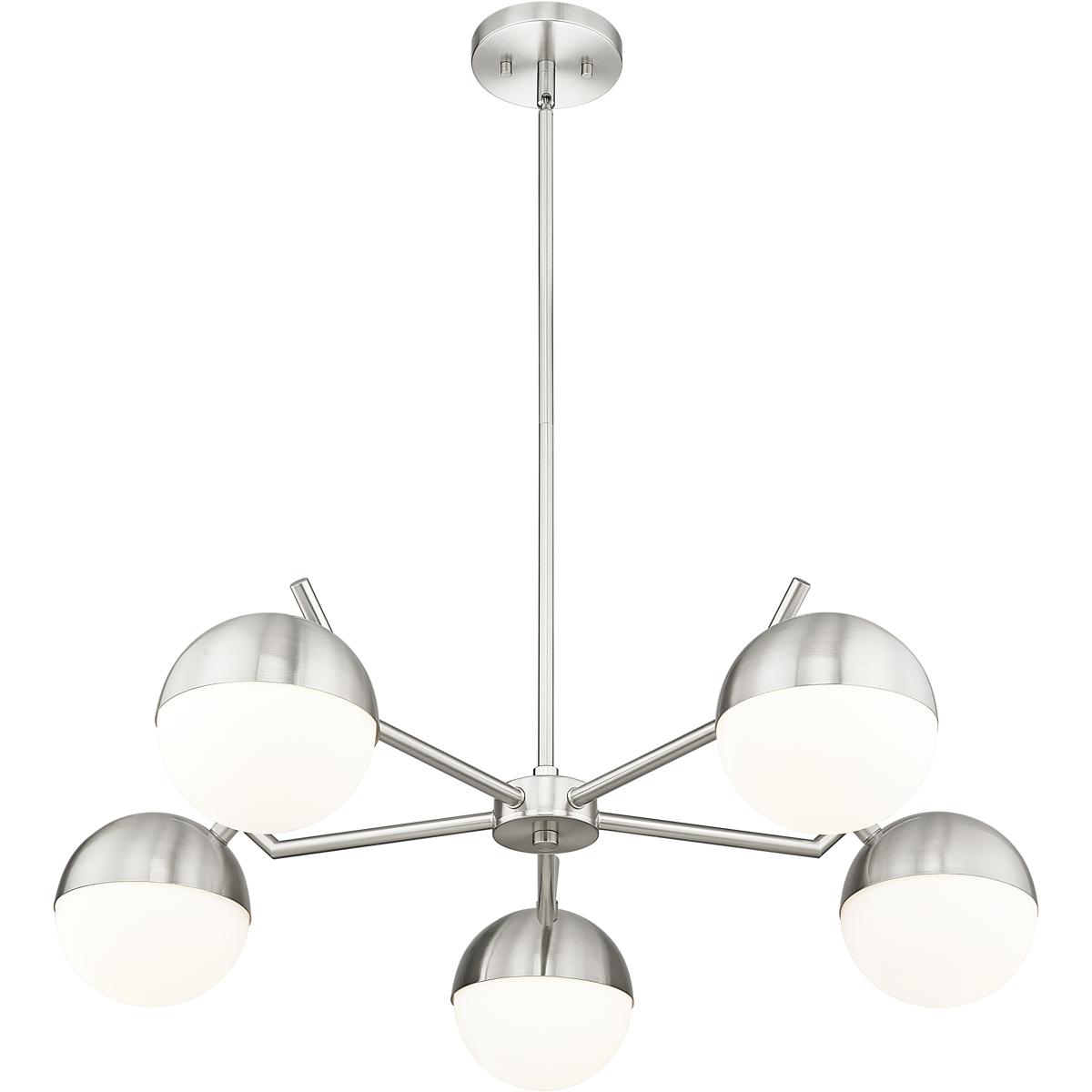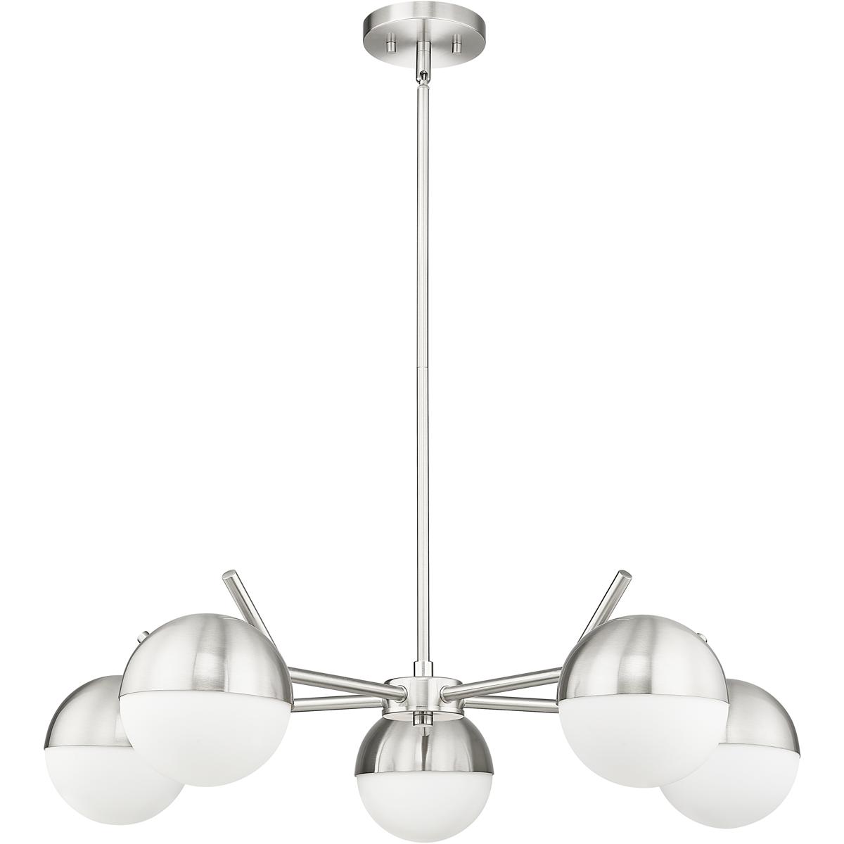 A radiant configuration of angular arms in a sleek brushed nickel finish create a compelling style for this modern five-light chandelier. Striking over a dining table or other gathering space, it features a clean, straight-lined silhouette and is complete with opal glass orb shades for inviting illumination.