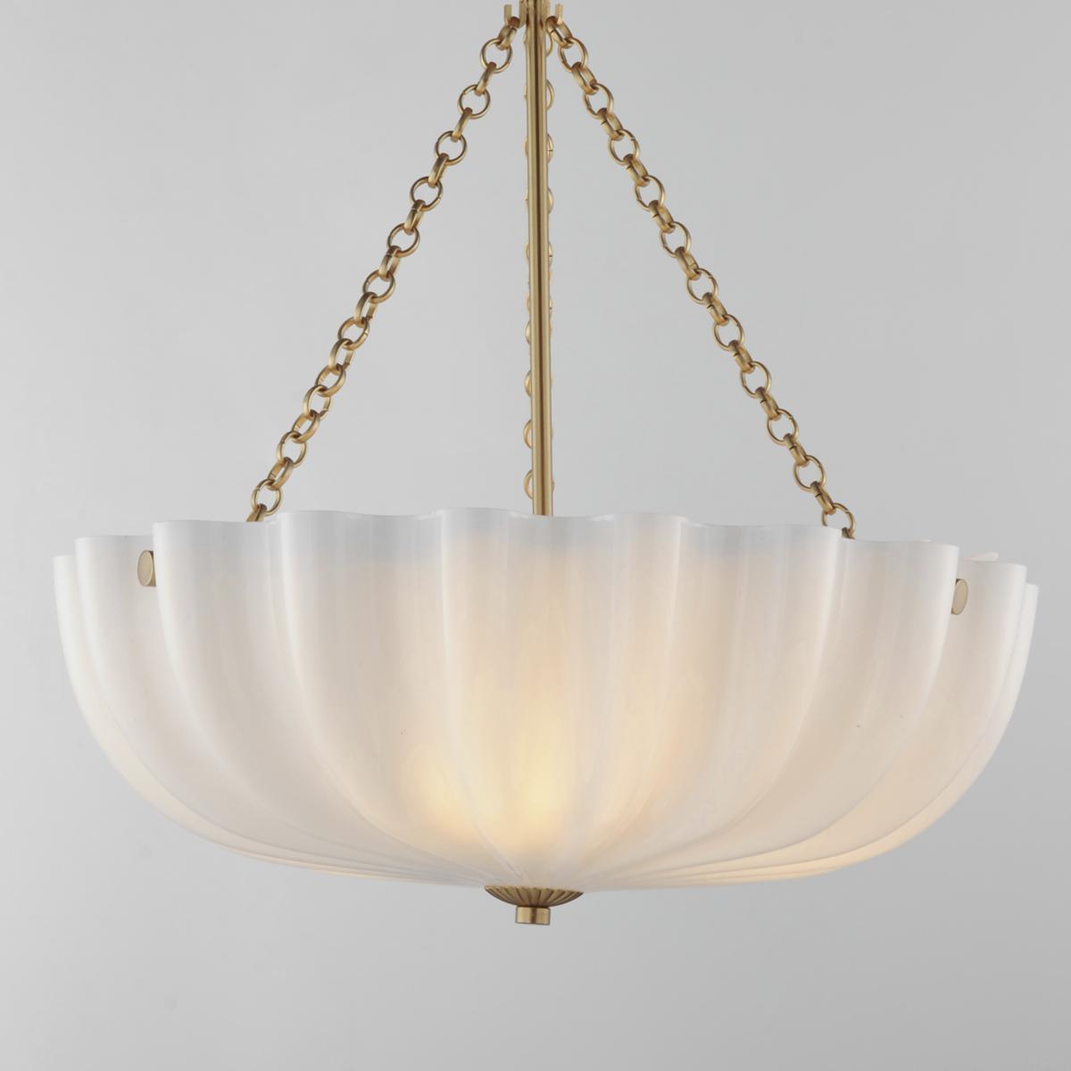 With glossy opal white glass shades, this collection brings a graceful, feminine touch to the inverted bowl design inspired by the shape of a bundt cake. Suspended by a decorative circular ring chain, the shade features an acrylic dust cover that encloses the top, keeping the glass pristine. Finished in Natural Aged Brass, the chain and metalwork complement the timeless elegance of the design, while ribbed glass accents add a distinctive, sophisticated detail to the design.
