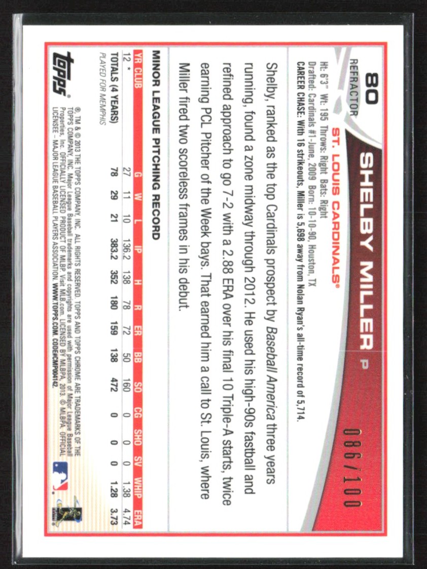 | Shelby Miller 2013 Topps Chrome Black Refractor RC Auto /100 #80 St. Louis |