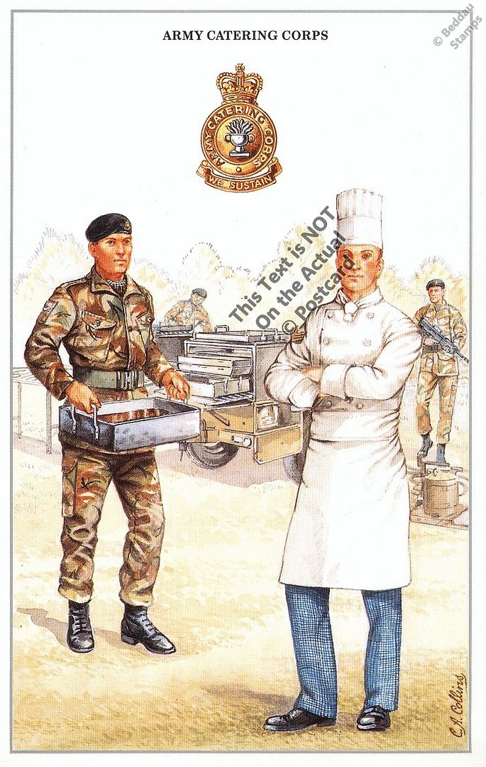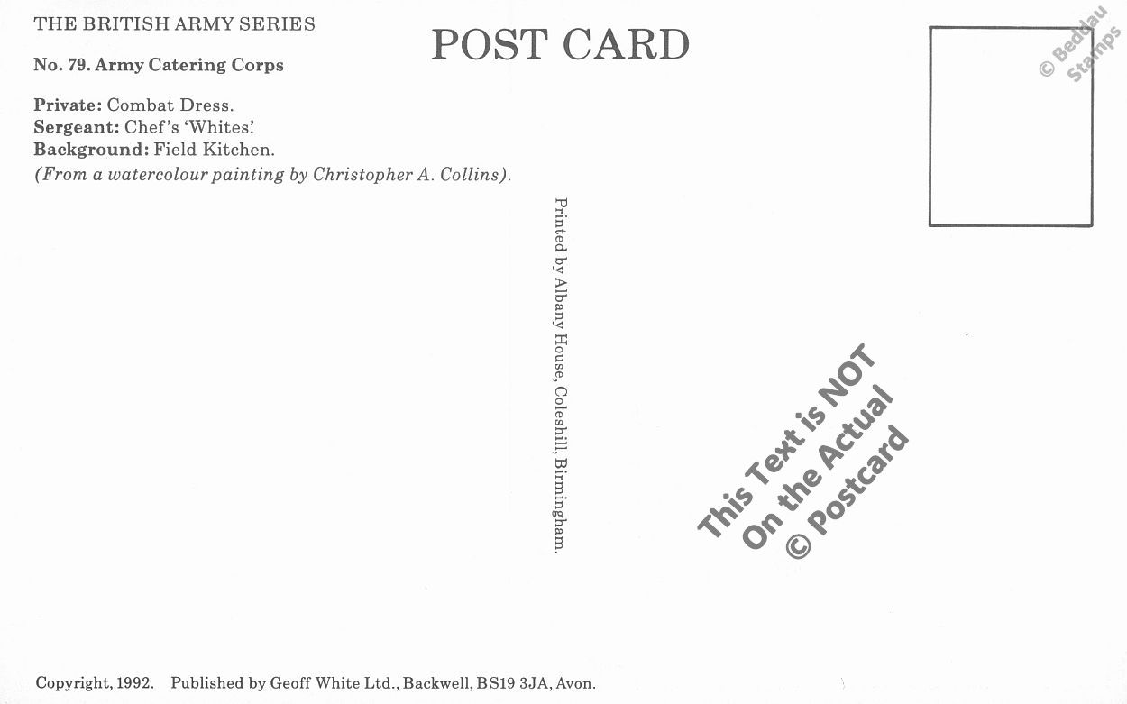On offer here is a 5.5x3.5 inch Postcard as per front and back scans below. The Digital Watermarks are not on the postcard itself. This is a GEOFF WHITE British Army Series postcard depicting two figures in modern day uniform; a relevant background scene; and the Unit's cap badge. ALL 82 Postcards of the series are available in our eBay Shop.