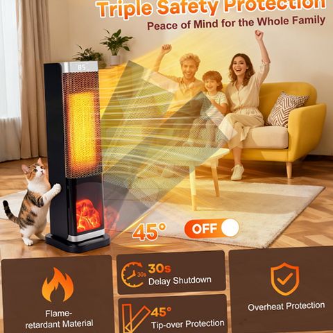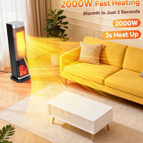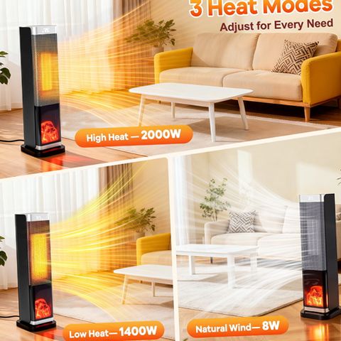 The WLRETMCI 2000W Tower Space Heater is a versatile and powerful ceramic electric heater ideal for creating a warm and comfortable environment in any indoor space. Utilizing advanced PTC ceramic heating technology, it provides rapid heat output within seconds, making cold rooms cozy quickly. The heater offers three heat settings 2000W high, 1400W low, and an 8W fan mode allowing you to customize warmth or airflow according to your needs. Its wide 70A° oscillation feature ensures even heat distribution across rooms up to 323 square feet, eliminating cold spots effectively. The integrated smart thermostat automatically maintains temperatures between 50A°F and 95A°F, while the ECO mode optimizes energy use for cost-effective heating. A realistic 3D flame effect enhances ambiance without smoke or ash, adding a stylish touch to your space. Safety features include tip-over auto shut-off, overheat protection, and a flame-retardant ABS body, making it safe for households with children and pets. The unit operates quietly at noise levels below 40dB, perfect for bedrooms or offices. User-friendly remote and touch controls provide convenient operation from anywhere in the room. Its sleek black tower design with a built-in handle offers portability and fits seamlessly into modern interiors. This space heater is an excellent solution for efficient, safe, and stylish indoor heating.