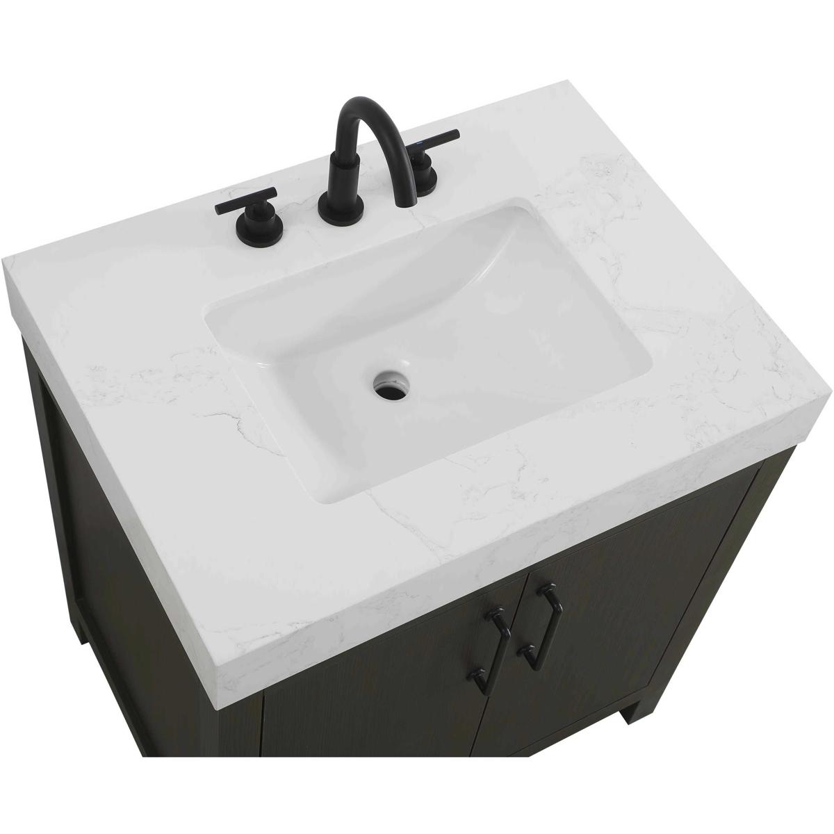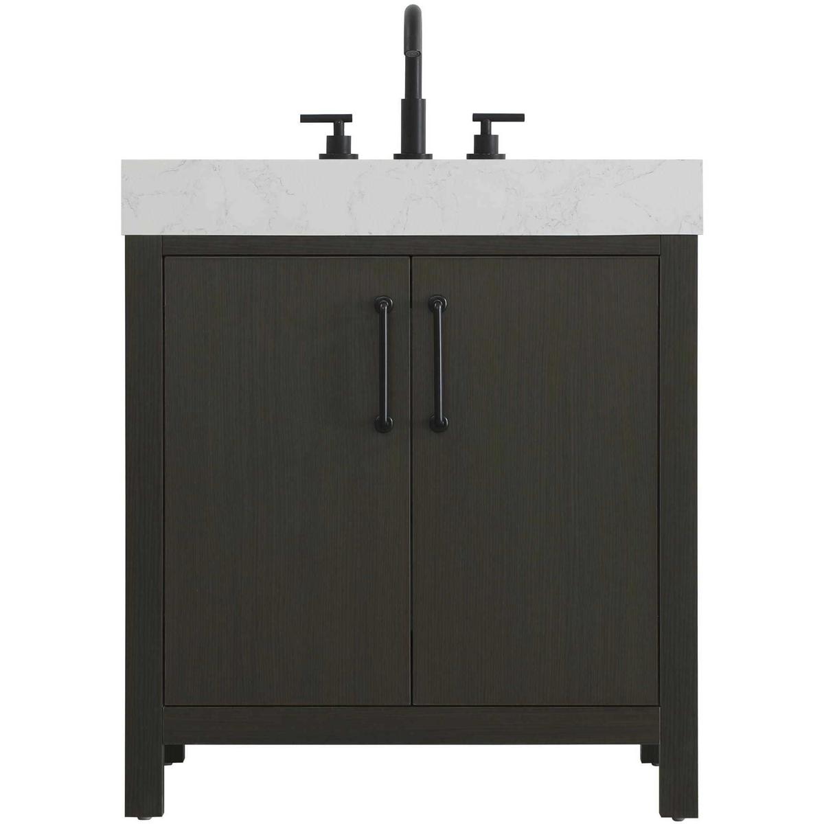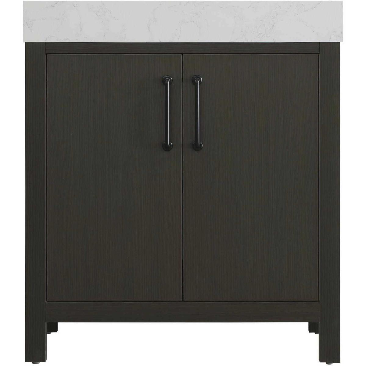 This bathroom vanity embodies a sleek, modern design with a strong, minimalist appeal. The deep mocha brown finish enhances the bold and sophisticated appearance, while the flat-panel doors and drawer fronts contribute to its clean, structured aesthetic. The wood's dark tone adds depth and richness, making it a striking focal point in any bathroom setting. The sturdy rectangular frame, combined with the thick engineered marble countertop, makes a bold and harmonious statement, providing an understated luxury without being overly ornate. Elevate your bathroom functionality with this thoughtfully designed bathroom vanity cabinet. The standout feature is the engineered marble countertop, boasting a bold 4-inch thickness and natural veining for a striking visual appeal. Built from durable solid wood and MDF, this vanity is made to last. The porcelain sink with a concealed overflow maintains a clean and seamless appearance, while the interior is cleverly designed with a U-shaped cutout on the shelf to accommodate plumbing without compromising storage. Soft-closing doors offer convenience and durability, paired with sleek modern handles for a touch of sophistication. This vanity is delivered fully assembled and equipped with foot levelers for effortless installation and stability. Complete the setup with an optional matching backsplash, sold separately. Combining practicality and bold design, this vanity is UPC certified and ready to transform your bathroom space.