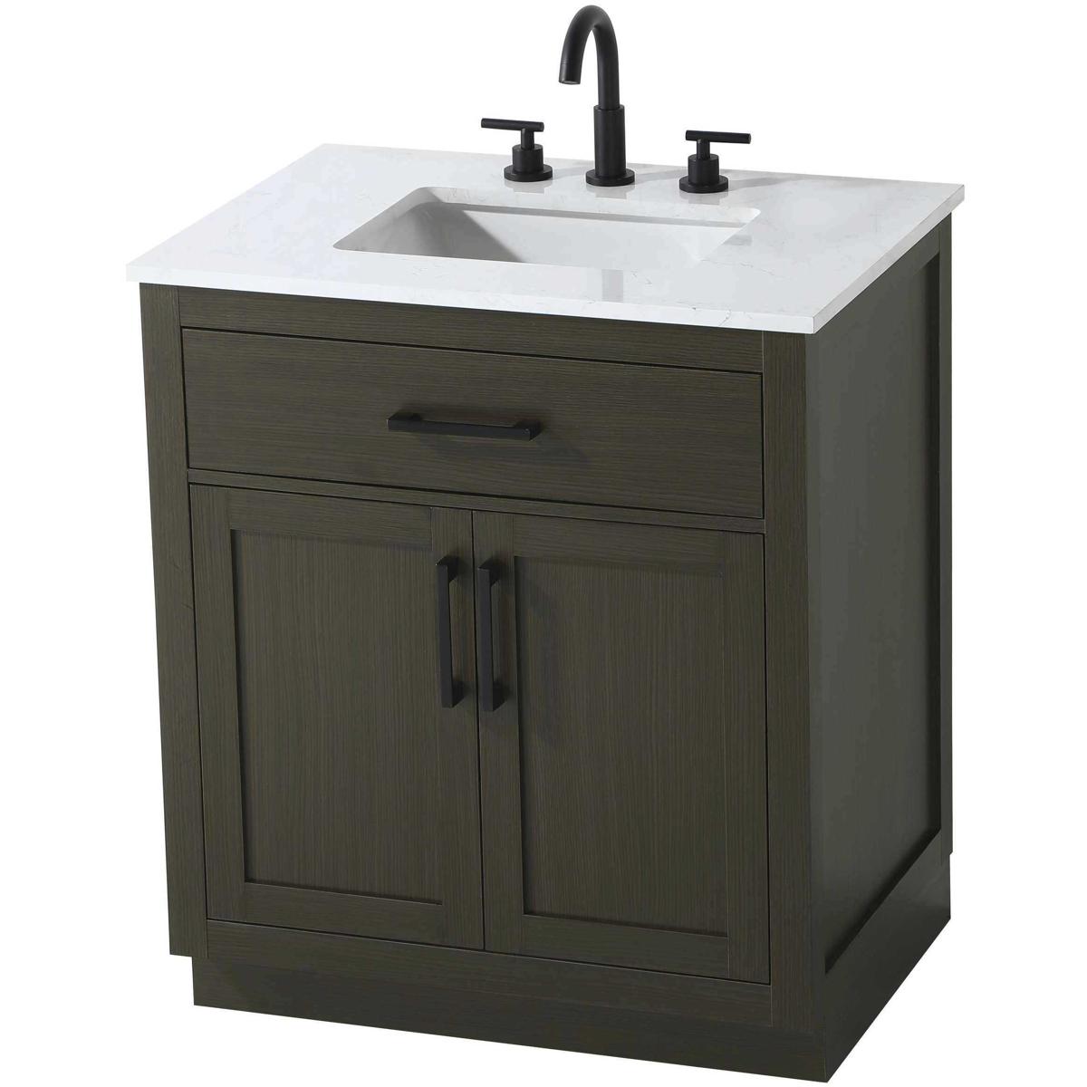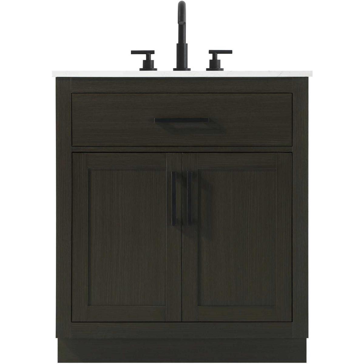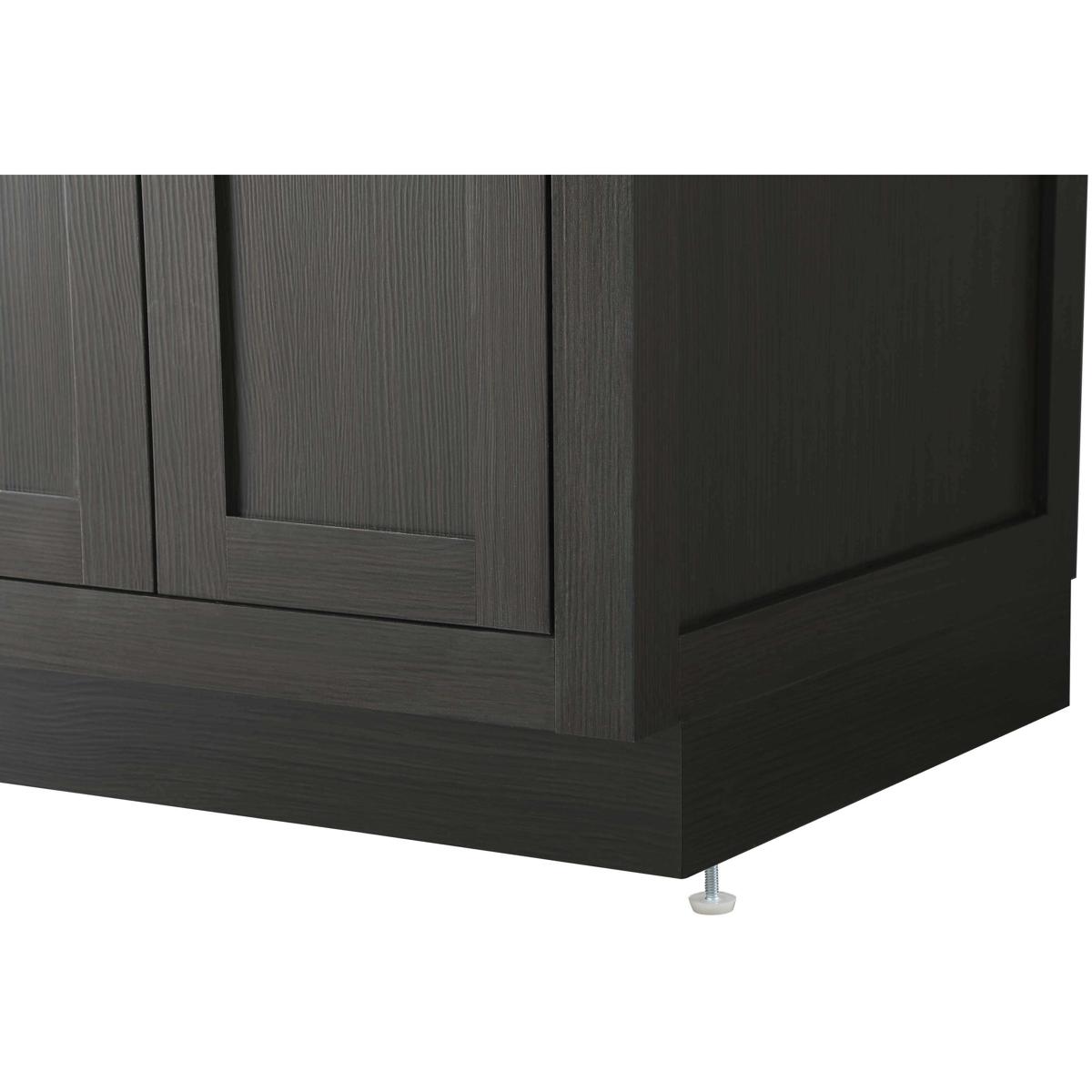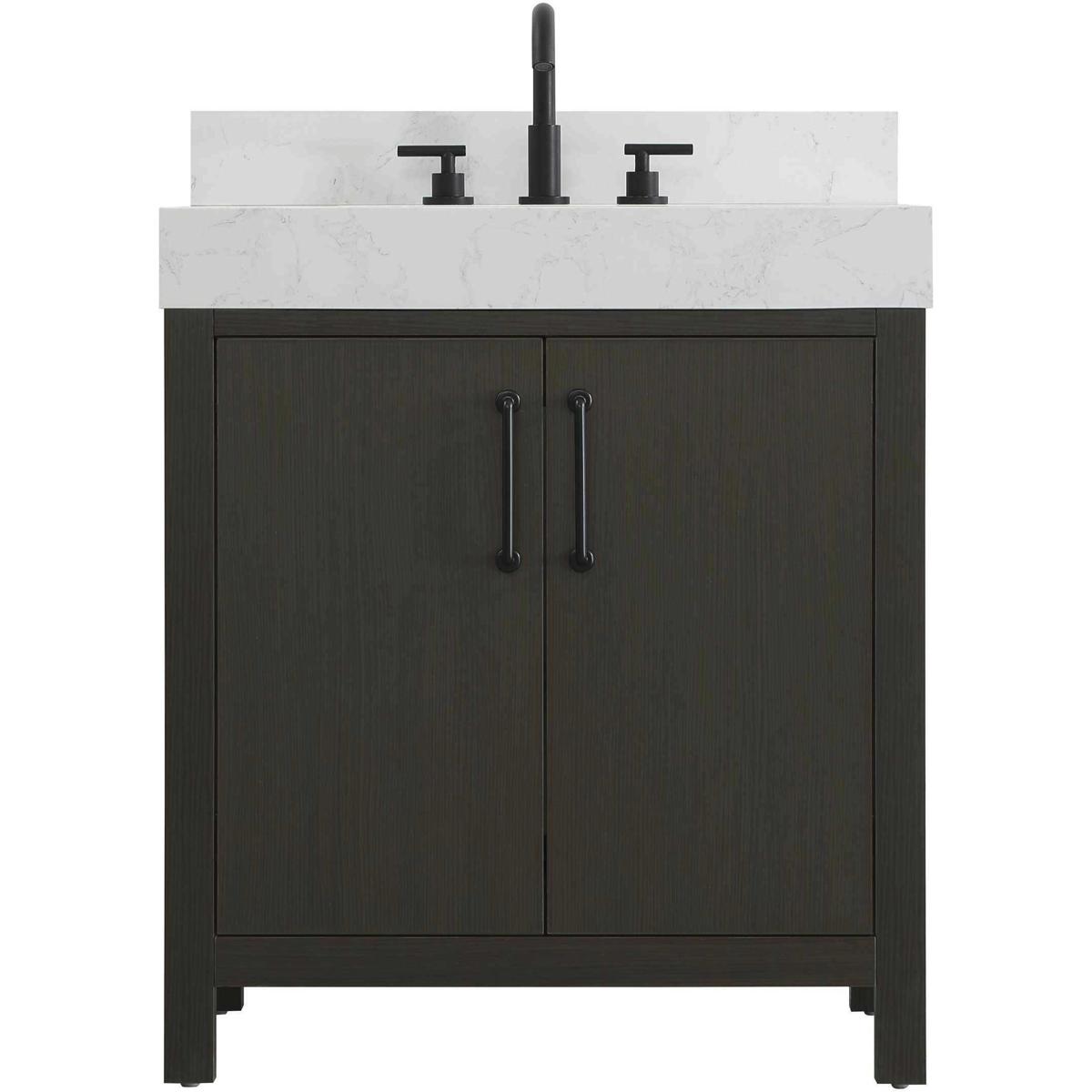 Introduce a perfect balance of functionality and style to your bathroom with this thoughtfully designed vanity. Constructed with a combination of solid wood and MDF, it offers durability and a sturdy build. The sleek engineered marble countertop with subtle grey marbling complements the rustic wood grain finish, creating a stylish and inviting centerpiece for your bathroom. Designed in a contemporary style with a transitional flair, it features a U-shaped shelf for seamless plumbing integration and multiple soft-close drawers for clutter-free organization. A pull-down drawer enhances convenience, while the toe kick adds a refined, clean-lined appearance and simplifies cleaning underneath. Matte black hardware contrasts beautifully with the cabinet finish, tying the look together. Delivered fully assembled and equipped with foot levelers, this vanity combines practicality and aesthetic appeal to suit modern and transitional bathrooms alike.