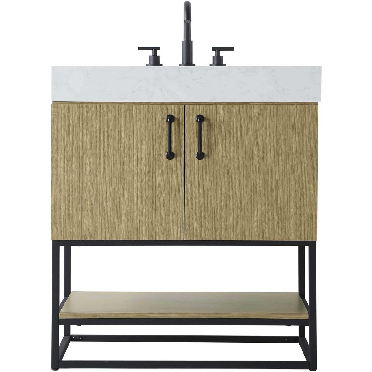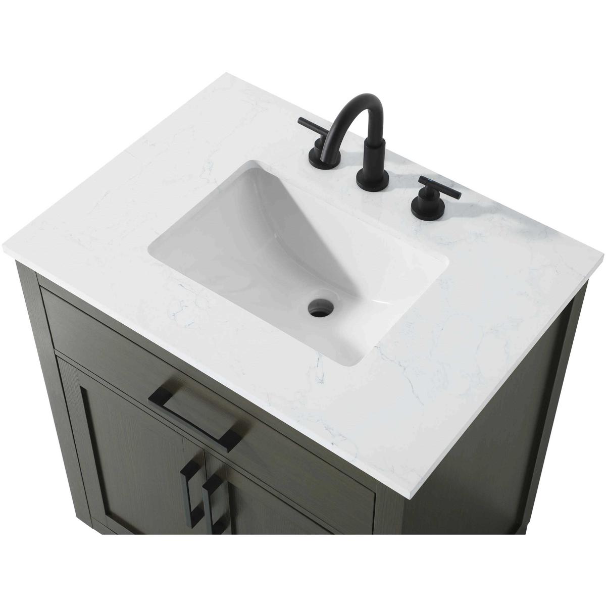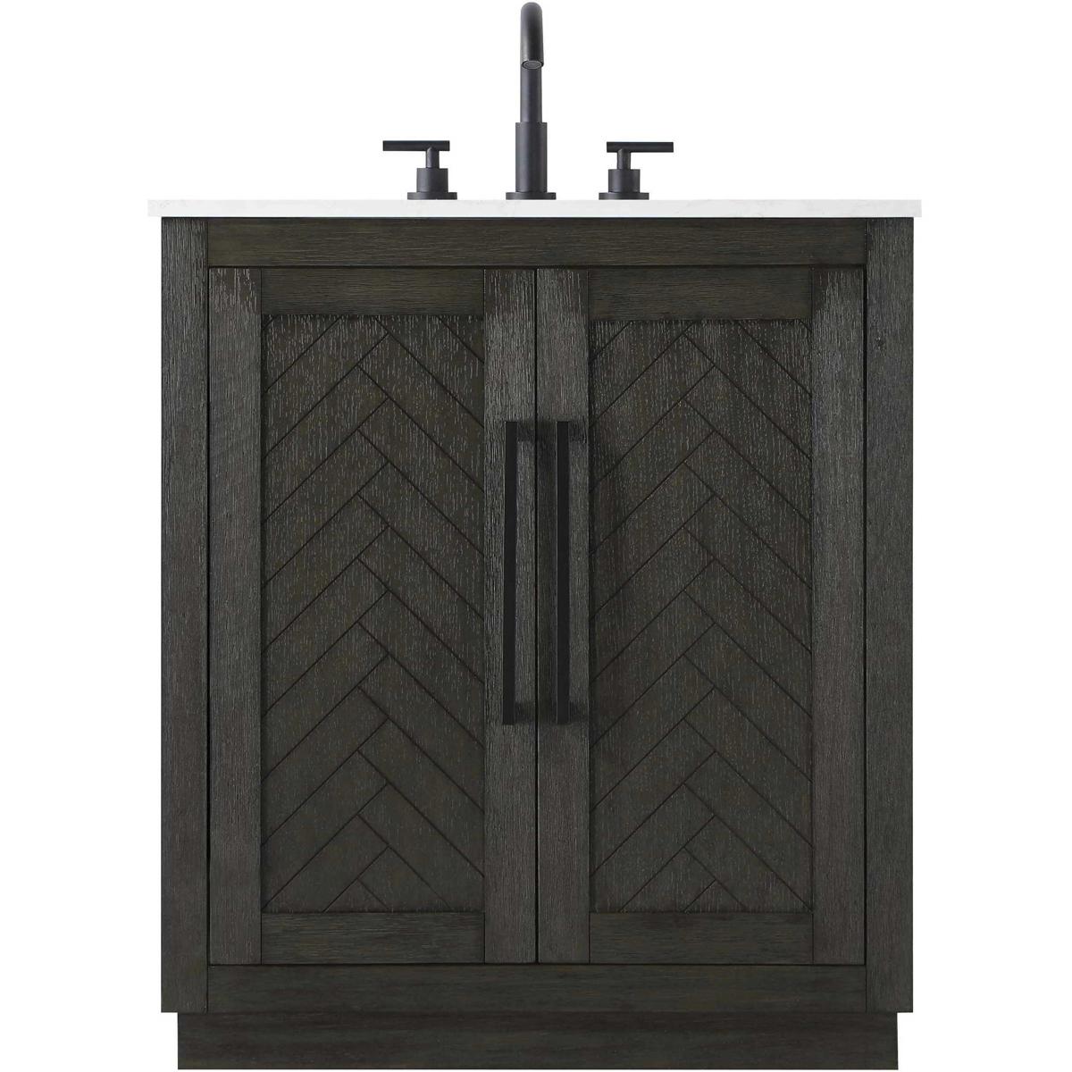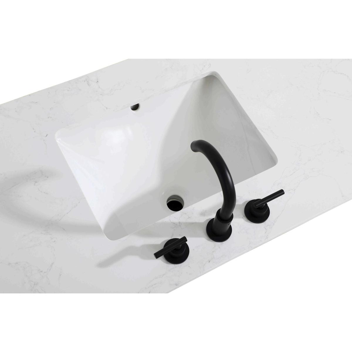 Introduce a perfect balance of functionality and style to your bathroom with this thoughtfully designed vanity. Constructed with a combination of solid wood and MDF, it offers durability and a sturdy build. The sleek engineered marble countertop with subtle grey marbling complements the rustic wood grain finish, creating a stylish and inviting centerpiece for your bathroom. Designed in a contemporary style with a transitional flair, it features a U-shaped shelf for seamless plumbing integration and multiple soft-close drawers for clutter-free organization. A pull-down drawer enhances convenience, while the toe kick adds a refined, clean-lined appearance and simplifies cleaning underneath. Matte black hardware contrasts beautifully with the cabinet finish, tying the look together. Delivered fully assembled and equipped with foot levelers, this vanity combines practicality and aesthetic appeal to suit modern and transitional bathrooms alike.