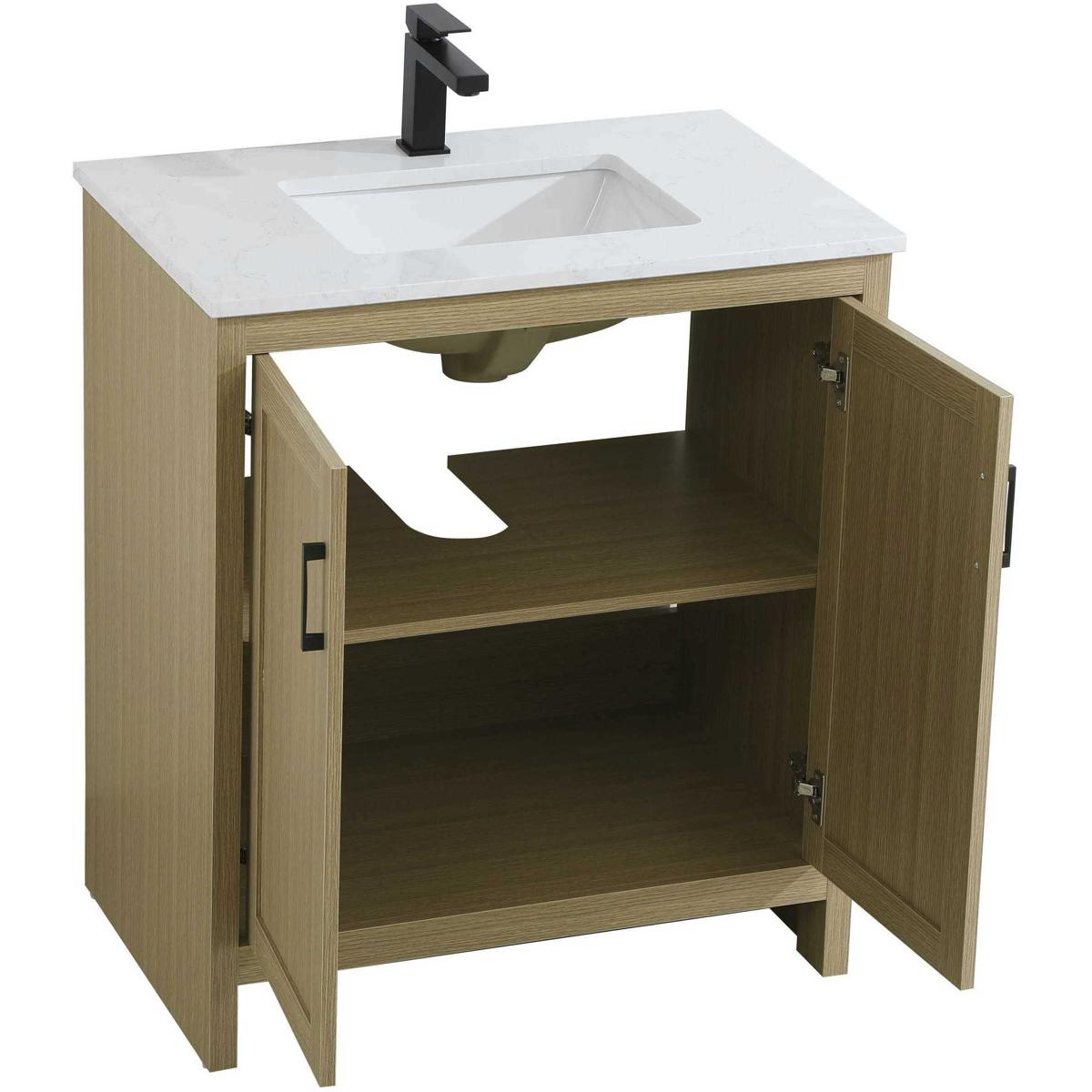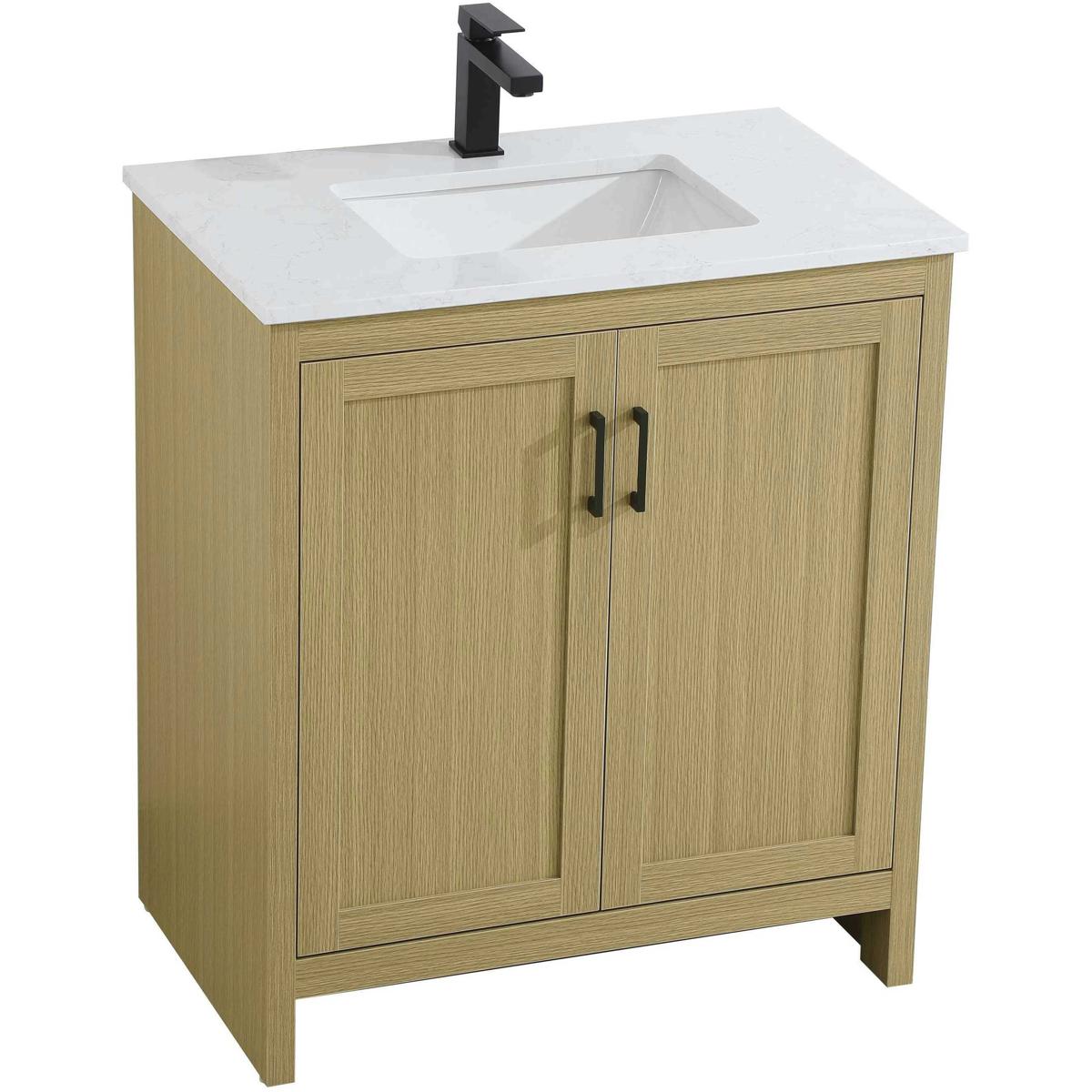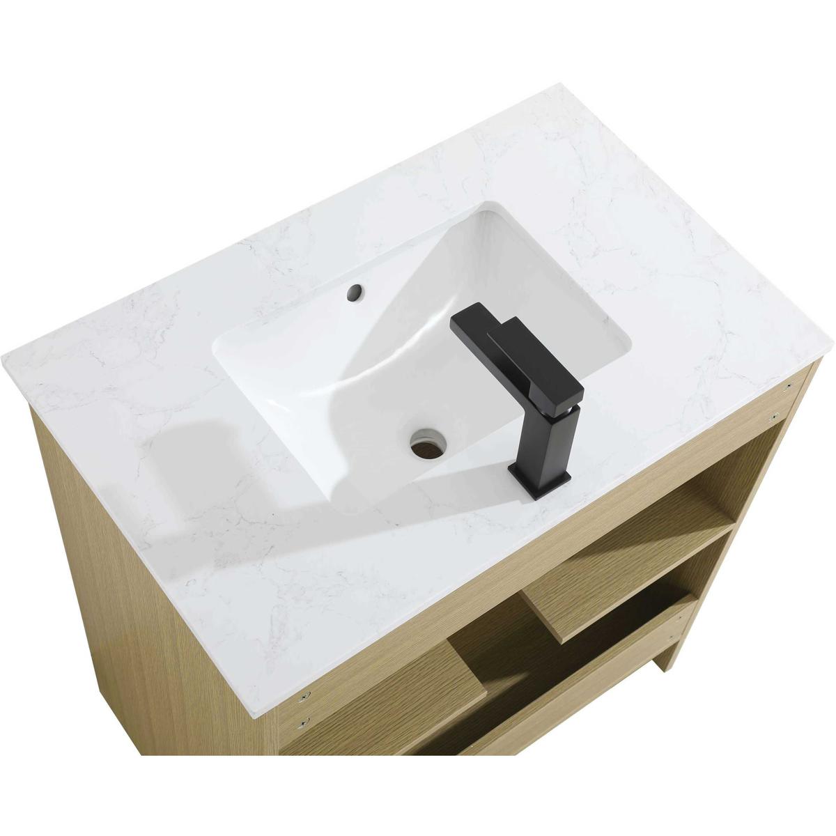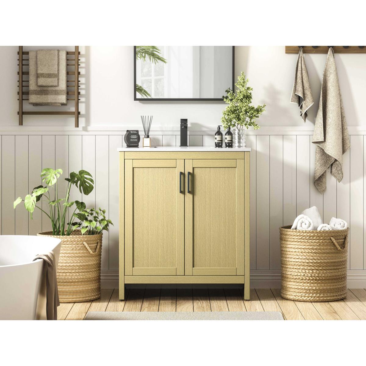 Redefine your bathroom with this transitional shaker-style vanity, designed to combine practicality with timeless aesthetics. Its clean lines and shaker-style door panels create a versatile look that complements both traditional and contemporary spaces. The engineered marble countertop, featuring a unique faux marbled pattern, adds a sophisticated focal point, while the integrated porcelain sink ensures durability and easy maintenance. The vanity includes a shelf with a smart U-shaped cutout, optimizing storage while accommodating plumbing. Crafted from sturdy MDF with a warm woodgrain finish, it brings a natural and inviting feel to your bathroom. Equipped with adjustable foot levelers for stability and a pre-drilled faucet hole for quick installation, this compact vanity delivers on both style and function. Best of all, it arrives fully assembled, ready to enhance your space right out of the box.