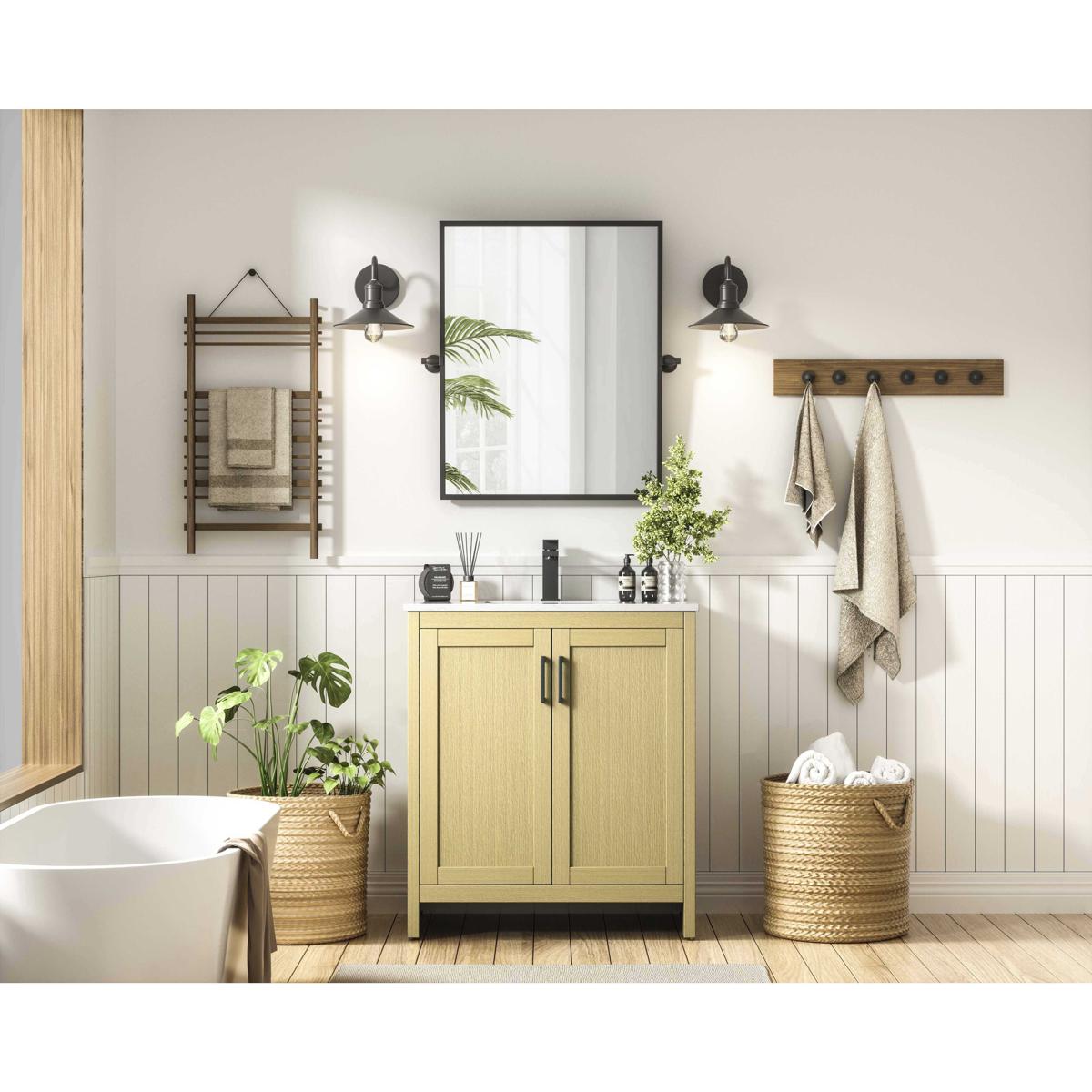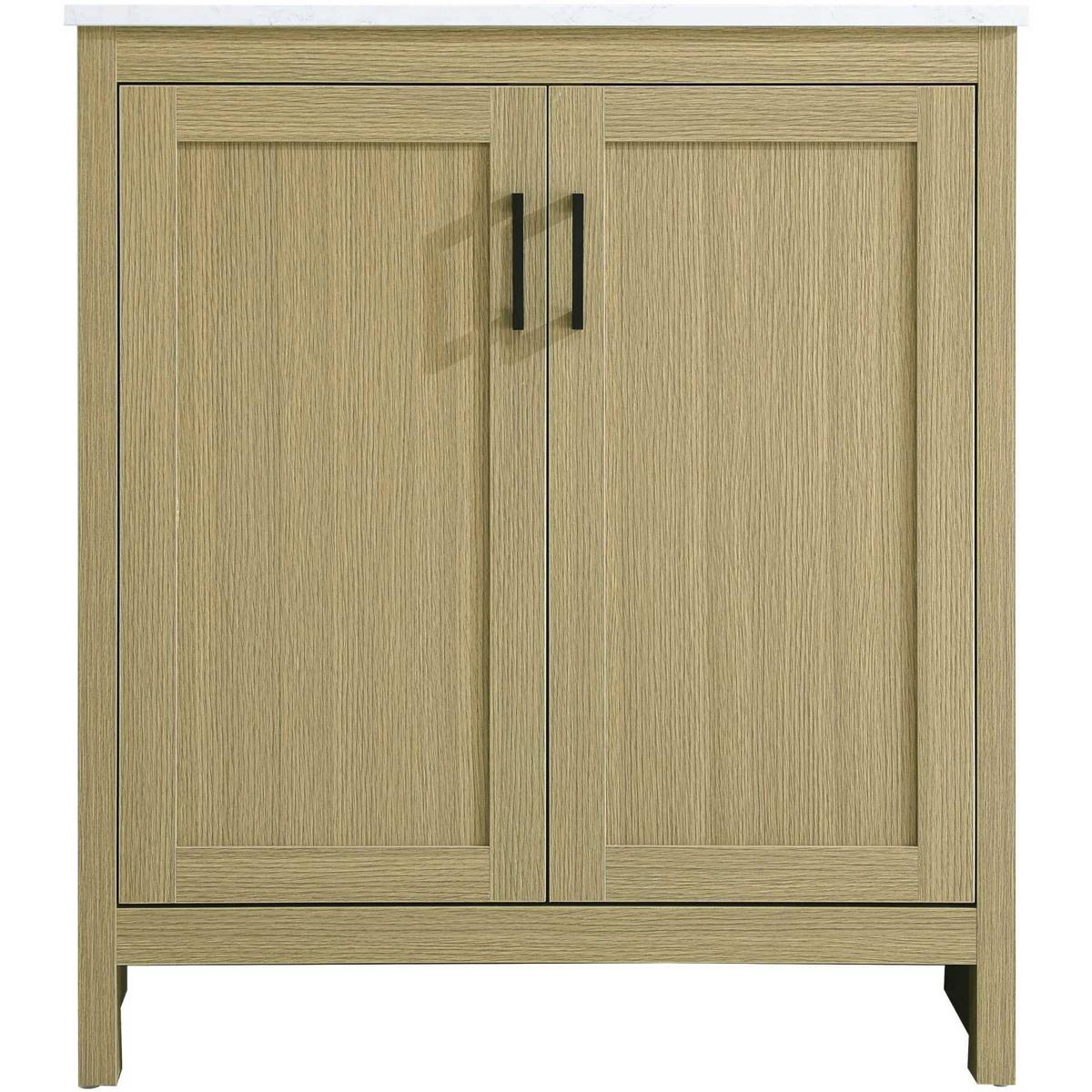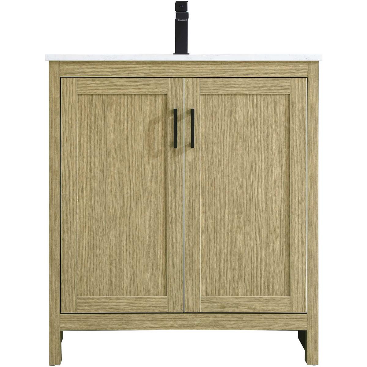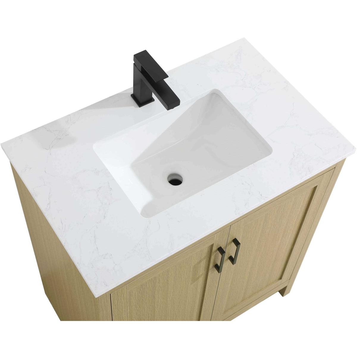 Redefine your bathroom with this transitional shaker-style vanity, designed to combine practicality with timeless aesthetics. Its clean lines and shaker-style door panels create a versatile look that complements both traditional and contemporary spaces. The engineered marble countertop, featuring a unique faux marbled pattern, adds a sophisticated focal point, while the integrated porcelain sink ensures durability and easy maintenance. The vanity includes a shelf with a smart U-shaped cutout, optimizing storage while accommodating plumbing. Crafted from sturdy MDF with a warm woodgrain finish, it brings a natural and inviting feel to your bathroom. Equipped with adjustable foot levelers for stability and a pre-drilled faucet hole for quick installation, this compact vanity delivers on both style and function. Best of all, it arrives fully assembled, ready to enhance your space right out of the box.