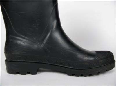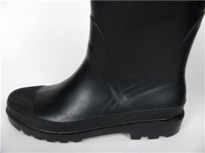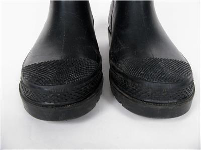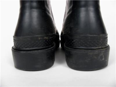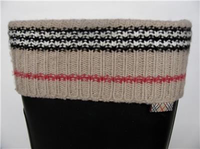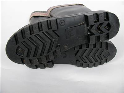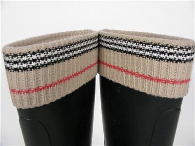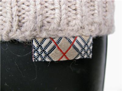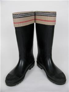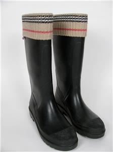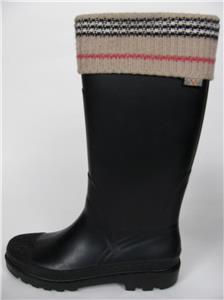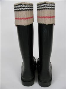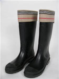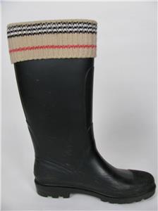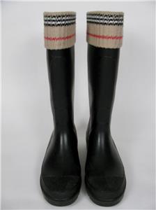 Black rubber tall (13" shaft) boots by Burberry. Front cap toe for extra protection. Lug soles with 1" heel and measures 10 1/2 " bottom sole from tip of toe to back of heel. Attached Signature Nova Check wool trim. Quality made in Italy