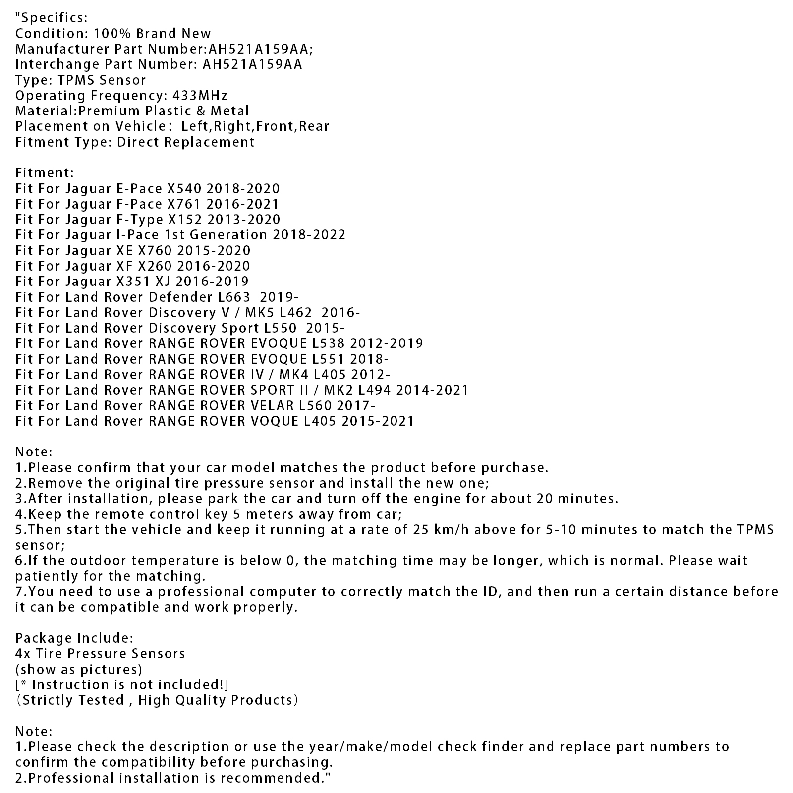 4X TPMS Tire Pressure Sensor For Land Rover Jaguar AH521A159AA