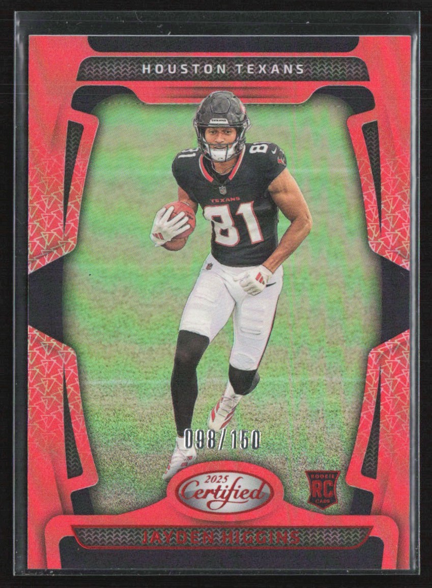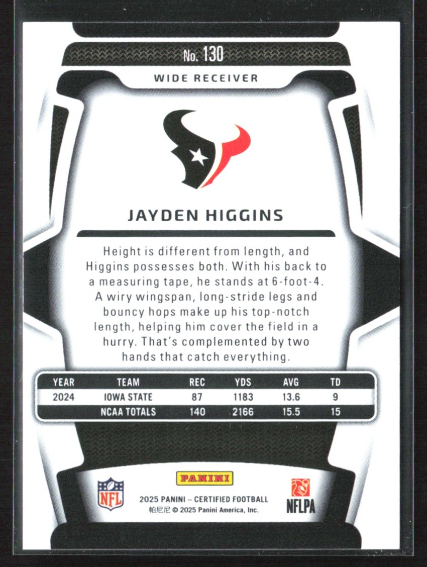 | Jayden Higgins 2025 Panini Certified Mirror Orange RC /150 #130 Houston Texans |