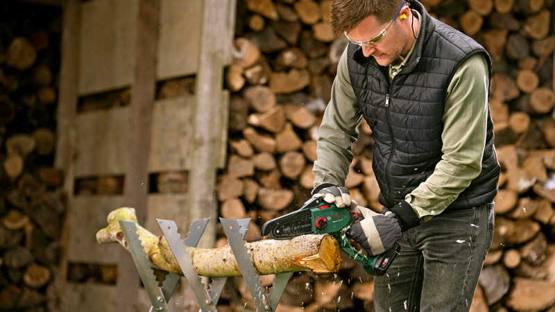 The cordless EasyChain 18V-15-7 powers through thicker branches fast. Easy to set up with the tool-free SDS assembly system, this saw delivers a high-speed pruning performance of 6.95 m/s while a high-quality Oregon chain cuts through wood up to 13 cm in diameter. The compact-size, well-balanced design, and soft grip handles enable effortless operation of this lightweight tool. Get all your pruning and sawing tasks done in no time with impressive up to 160 cuts per charge*. (*with 2.5Ah battery) The built-in Bosch Syneon Technology provides optimum power and maximum runtime. The tool belongs to the 18V POWER FOR ALL system. One battery can be used in all 18V POWER FOR ALL tools.