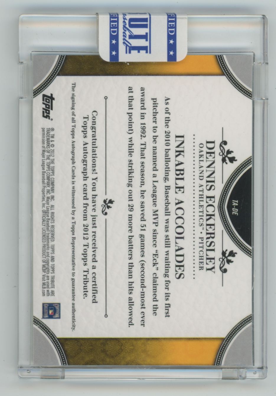 | Description: | Dennis Eckersley | | Category: | Baseball | | Year: | 2012 | | Product: | Topps Tribute Gold | | Team: | Oakland Athletics | | Card Number: | TA-DE | | Hand Signed: | Yes | | Serial Number: | /15 | | Dimensions: | 4¼" x 2¾" | | SKU: | BL R0777 R01 B (6) |