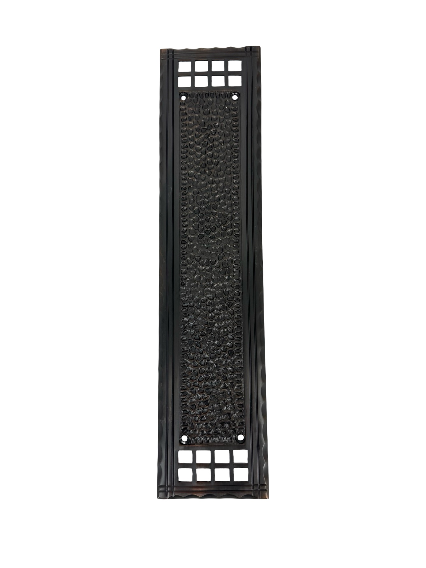 Aged Oil Rubbed Bronze over Commercial Brass. Hand hammered push plate.